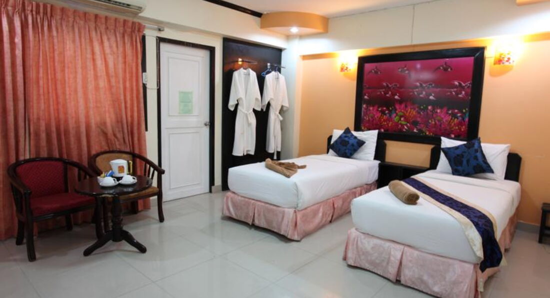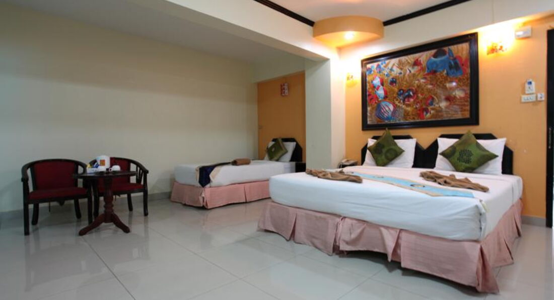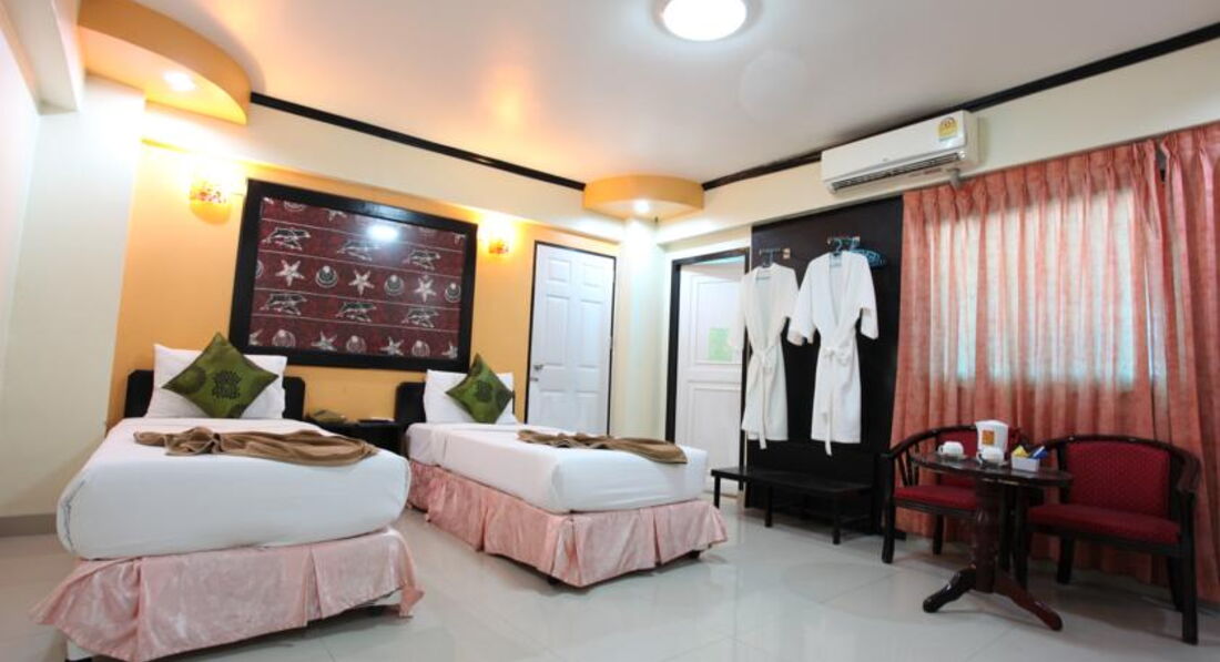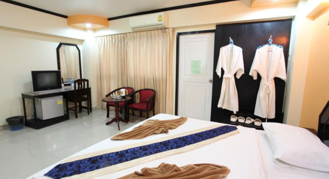 отель находится в центральной паттайе. для своих 2-х звезд вполне приличный. расположен на центральной улице в глубине за Royal Century . в отеле находился 2 дня до поездки на кочанг. в принципе ( учитывая что это 2-ка а не 3,4,5) вполне подойдет для экономотдыха . заселение 5 минут,причем депозита нет, в отзывах хотя писали что был. много индусов-похоже хозяин оттуда. WI-FI на каждом этаже я на ресепшене попросил-мне дали пароль бесплатно. в номере есть чайник пакетики чая кофе сахар + 2 пластиковых бутылки воды. мебель- естественно старенькая. кондишин не шумел. был приятно удивлен когда на завтраке обнаружил свежевыжатый апельсиновый сок. завтрак приносят в тарелке, уже дозированный. для 2-ки вполне пойдет.