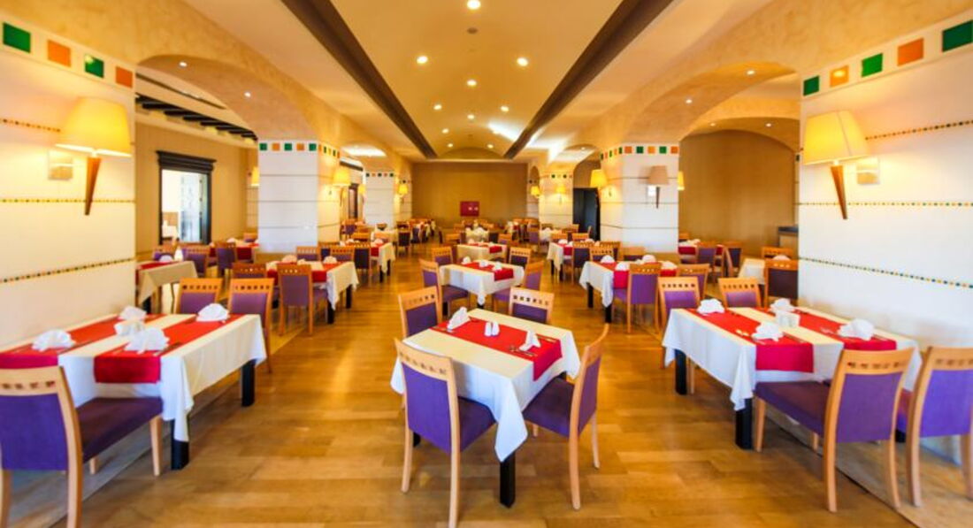 Бари та ресторани: головний ресторан розрахований на 800 осіб (критий, з кондиціонером, літня тераса, дієтичне меню, дитячі стільці), лобі-бар (10:00-24:00), бар біля басейну (10:00-18:00) ), бар на пляжі (10:00-23:00), вітамін-бар (10:00-18:00), диско-бар (23:30-02:30) та ін. 4 ресторани A la Carte: італійська , турецька, рибна, мексиканський - відвідування безкоштовно 1 раз за час проживання, за попередньою резервацією.