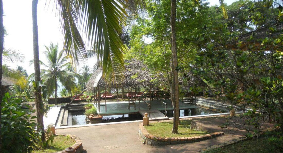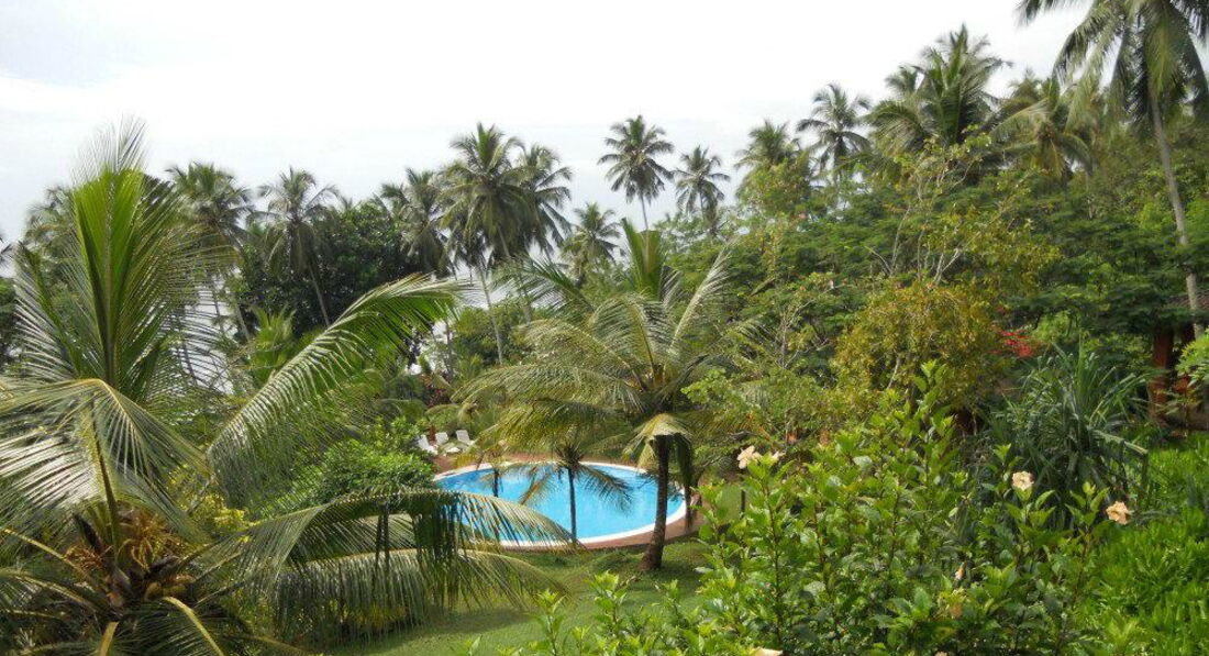 Территория отеля - очень крутая в плане многообразия растений и животных. Кого там только нет, и вараны и гиконы, куча бурундучков, изредка прибегали обезьяны, прилетали павлины, рядом с нашим шале бы пруд, где плавали огромные рыбы. Короче экзотики хоть отбавляй. Пугали в отзывах змеями и москитами, но то ли врали, то ли в это время года их не было. Фруктов очень много, кокосов еще больше, витаминный запас обеспечен на год вперед. Бассейны действительно грязные, а территория плохо убирается. Вообще ланкийцы очень медленный и немного ленивый народ, это не турки. Поэтому ждать от них сервиса не приходится!