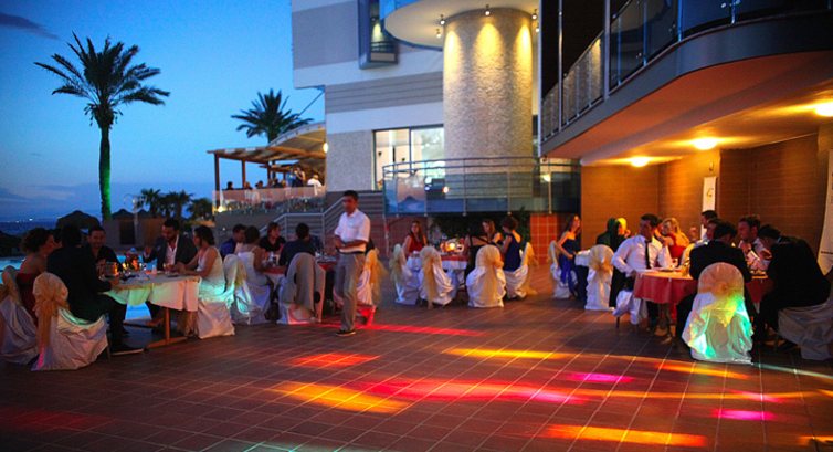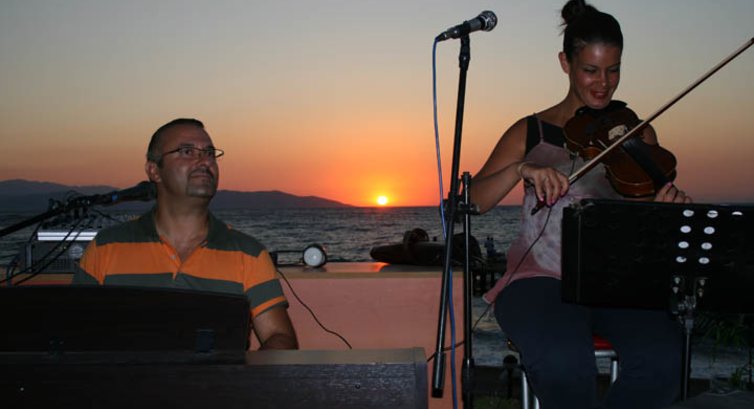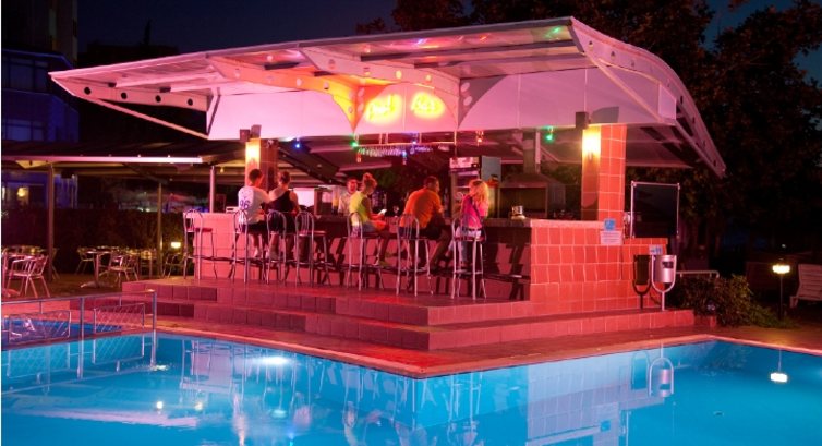 На территории отеля расположены 2 бара, в которых за обедом и ужином наливают белое,красное или розовое вино местного производства. Ресторан находится на открытой террасе с видом на море. Наслаждаясь едой можно наблюдать потрясающий закат - солнышко садится за греческий остров Самос. Каждый вечер для гостей поёт песни в джазовой обработки на всех языках замечательный дядечка)