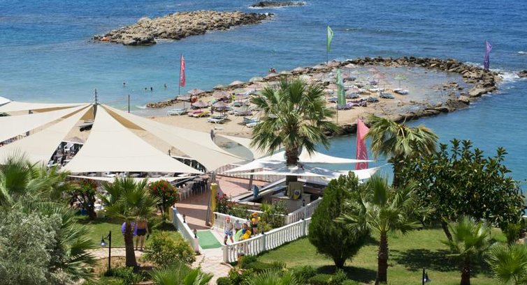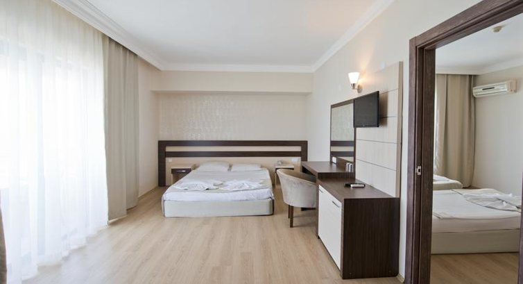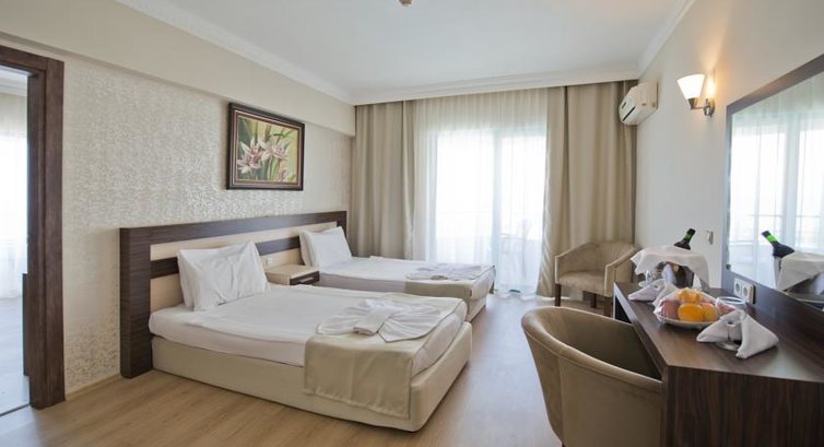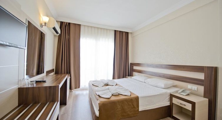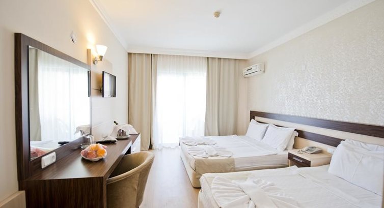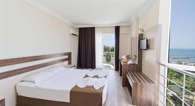 Ездили отдыхать в этот отель с мужем и семейной парой с маленьким ребёнком. В Турции первый раз. Впечатлений много. Мы не привередливые, ехали с хорошим настроем. Но даже нас отель неприятно удивил.. Приехали мы рано утром, около 10 часов. Заселили нас сразу, но... Когда зашли в номер - шок. Номер был неприбран после предыдущих гостей, стояли мужские ботинки, пепельница с окурками, пустая бутылка виски, мокрые полотенца, пачка из-под презервативов... У друзей в соседнем тоже самое, мужские трусы и прочее. Пошли на ресепшн, попросили поменять номера, перед нами не извинились, номера менять отказались, сказали, что у горничных обед, вас раньше времени заселили, мол, радуйтесь. И, кстати, не одних нас заселили в грязный номер, почти с каждого заезда люди ходили ругаться. Номер "прибрали"... Готовьтесь к тому, что приборка в этом отеле означает только заправить постель и выкинуть мусор из ведра!!! Ванная комната в ужасающем состоянии, сама ванная желтая, перегородка вся в разводках, сантехника с жутким налетом, плитка на стенах тоже вся в пятнах и разводах. Горничные это не убирают, хотя средство для мытья у них есть. Взяли сами у них с тележки и залили средством всю сантехнику, чтобы было не так брезгливо. На полу в номере ковёр, он весь в белых пятнах, остаётся только догадываться об их происхождении... Шторы грязнущие, тюль у нас был с дырой сантиметров 30, кондиционер подтекал, включили один раз и жалели потом всю ночь, так как даже после того, как мы его выключили, капало с него до утра. Кстати, из-под ванны после душа на полу всегда были "озера". Сейф в номере, кстати, тоже не работает. Хотите убрать ценные вещи, придётся оставлять на ресепшене, 2 доллара за сутки. Электронные замки на входных дверях заедают, неоднократно на нашем этаже постояльцы с этим сталкивались, кому-то и полчаса дверь открывали, нам в последний день тоже не повезло. Ключ от номера дают только один. Полотенца в номера не кладут!, как и шампуни и туалетную бумагу! Брали сами с тележки, полотенца просили на ресепшене. Это у них в отеле также в норме. Мы понимали, что не в 5 едем, но, конечно, не ожидали до такой степени загаженный номер. Территорию же отеля прибирают хорошо, моют с утра всё и в течение дня, убирают пляж, чистят бассейны, прибирают туалеты. Но:)), во всех туалетах на территории сломаны замки:), их не меняют, вот так по-домашнему... Территория отеля большая, все удобно расположено, два больших бассейна, в каждом из них есть местечко с маленькой глубиной для детей, эта зона огорожена от основного резервуара. У каждого бассейна свой бар. Есть также маленький бассейн с водными горками. Горки, конечно, так себе, все швы чувствуются, на винтовой так и вообще шов разошёлся сантиметров на 5-7. Но хотя бы какое-то развлечение:) Кстати, смотритель на горках только для галочки, за безопасностью не следит, будьте аккуратны, следите сами. Есть небольшая рощица с видом на море и лаунж-зонами, там же лежаки, это если хочется посидеть в теньке. Есть терраса на втором этаже отеля с видом на море. Столики у снек-бара, столики у каждого из баров, у бассейна. Каждый найдёт себе местечко, где оттохнуть. Правда, если успеете занять себе там заранее место:) Море в двух шагах, пляж свой. Вход галька, где-то мелкая, где-то и булыжники. Если отойти от отеля влево, метров на 100-150, там отличный песчаный пляж. В первые два дня в о