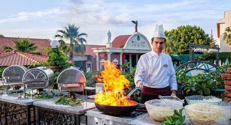 Бари та ресторани: головний ресторан розрахований на 800 осіб (критий, з кондиціонером, літня тераса, дитяче меню, дієтичне меню, дитячі стільці), лобі-бар (10:00-24:00), бар біля басейну (10:00- 24:00), бар на пляжі (10:00-27:00), вітамін-бар (08:00-20:00), сервіс-бар (19:00-21:00) та ін. 2 ресторани A la Carte: китайська, японська - платно, за попередньою резервацією.