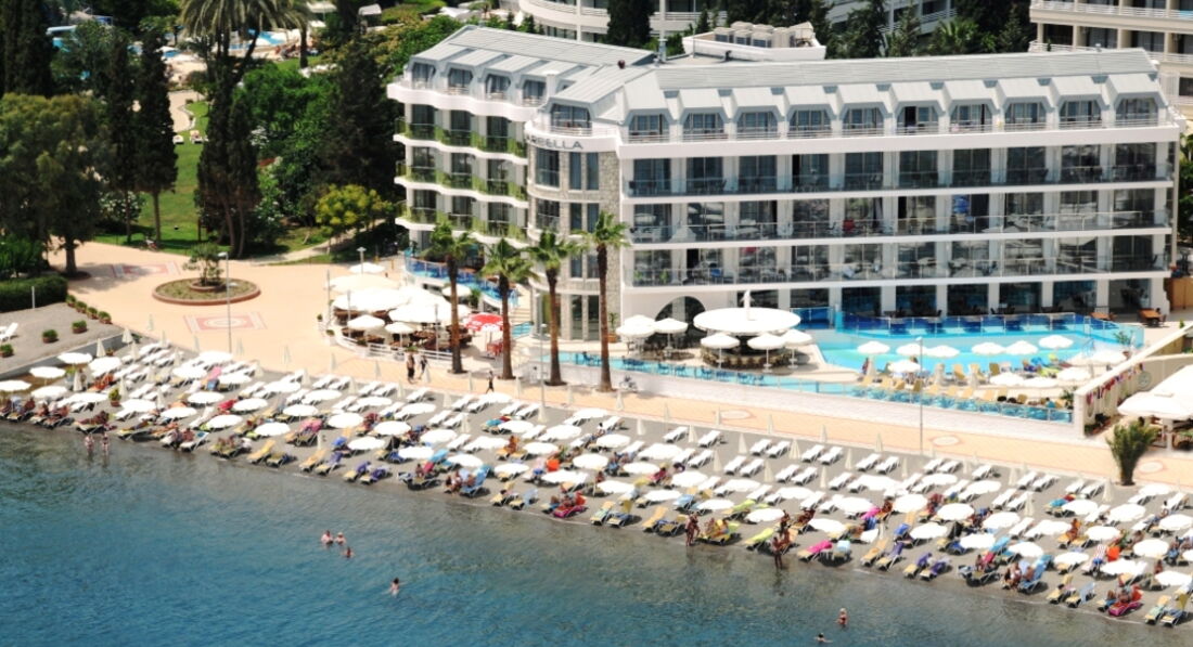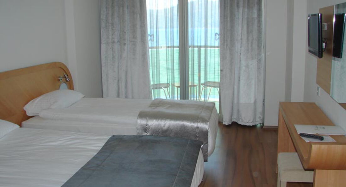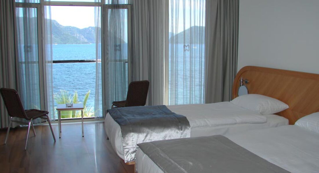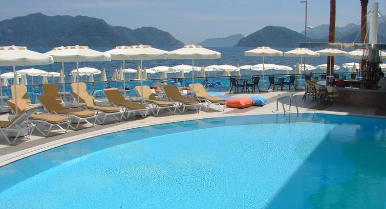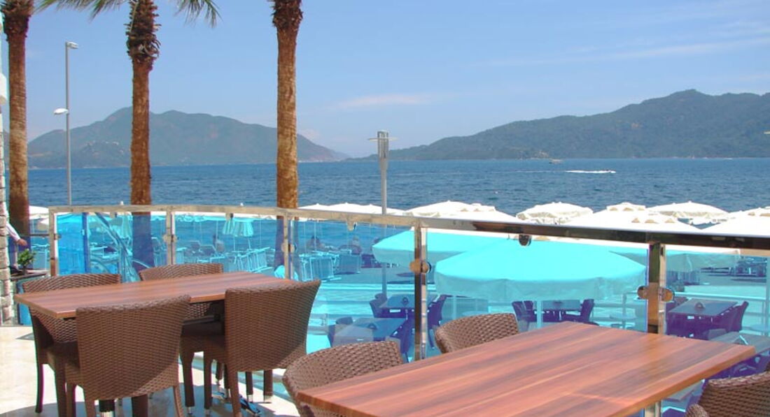 Отель не понравился, но не хотелось портить себе отпуск и зацикливаться на недостатках, поэтому, закрыв глаза на многие вещи, отдохнула очень даже неплохо. Ожидала намного большего, прочитав тут отзывы. Понятно, что это 3-ка, но все же некоторые вещи очень расстроили. Соглашусь с тем, что большой плюс этого отеля в том, что находится он на первой линии и имеет свой пляж (маленький, скромненький с серым песочком) - это его как-то реабилитирует.Вообще в Мармарисе нет шикарных пляжей, все очень компакто и скромно, узенькая полоска пляжа, вдоль которой многоклиметровый променад ,где приятно прогуляться вечером! Убил ресторан. Даже не скудностью еды, это можно пережить, голодным,думаю, никто не был, а какой-то неопрятностью ужасной. Он находиться на улице, вокруг кусты, нде живут кошки, которые постоянно выпрыгивают оттуда, лезут под стул, просят еду. А утром приборы кладут на стол без скатерти почему-то!! Есть в этом ресторане было не очень-то приятно((. Не особо-то приятные официанты со своими предложениями встретиться вне отеля..... Номер не очень чистый, в малюсенькой душевой кабинке, где еле можно развернуться, вода уходила очень плохо и постоянно попадала на пол... Вообщем , кроме прекрасного вида с балкона моего номера, отель больше похвалить не за что!