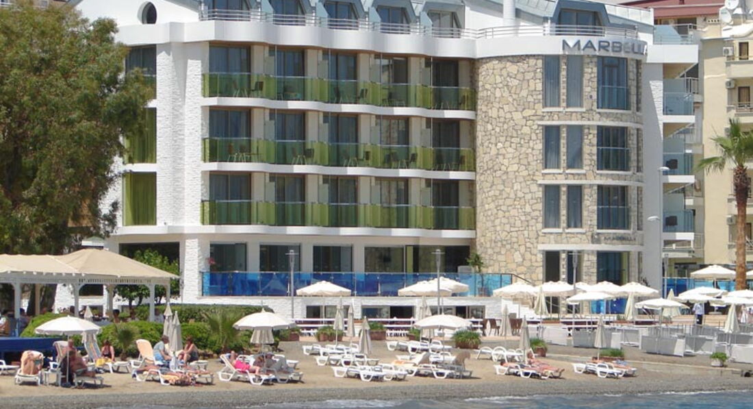 Отдыхали в отеле с подругой в сентябре 2008г, ездили от турфирмы Ривьера. Сразу скажу, что изначально приехали отдыхать в отель Aeagin Park, но буквально в первые часы поняли, что жить в нем, а тем более получить приятные впечателение об отдыхе не возможно. Не буду писать подробно об отеле Aeagin Park, все отрицательные отзывы на сайтах полностью соответсвуют действительности, начиная от отсутствия горячий воды в душе, до подножного корма, который дают там в качестве еды...Но вернемся к Марбелле. Как только нам удалось убедить представителя турфирмы, что наше намерение переехать в другой отель абсолютно серьезное и мы не передумаем, нам предложили несколько вариантов отелей, в том числе и Марбелла. Мы пошли прогуляться до отеля и увидеть его воочию, не полагаясь на нашего гида. Что сразу понравилось: наличие своего пляжа, по меркам Мармариса - довольно большого:), после того, как рассказали администратору цель нашего визита и попросили показать нам комнаты, он с удовольствием провел миниэкскурсию по отелю и показал комнату с прекрасным видом на море, в которой мы будем жить, если переедим к ним. К слову, почти все номера в гостиницы имеют вид на море. Вообщем мы приняли решение переезжать, осталось уладить формальности: наша путевка стоила на человека 26 тыс. на 11 дней с вылетом из СПб, местный гид из Ривьеры попросил доплату в размере 180$ за двоих за оставшиеся 9 дней отдыха, после звонка в офис Ривьеры в СПб, сумма уменьшилась до 120$, оказывается ко всему прочему, скромная девочка из Ривьеры оценила свои услуги не много не мало как в 60$.