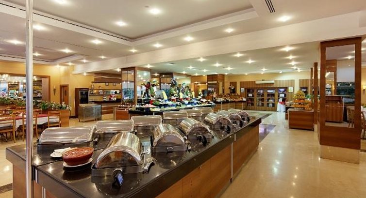 Еда никак не тянет на 5*. Ресторан больше похож на столовку! Посуда грязная!!! Выбор еды скуден, мяса не ждите! Кура ежедневно, индейка и скумбрия по праздникам! Фруктов нет! Что- то типа арбузов, черешни, персиков и т.д. не нам только снились. На выбор яблоки, грейфы и апельсины. На завтрак бывают яичница и оладьи, но кто не успел, тот опоздал. Либо стой очередь в 20 человек! И то не больше 3 в руки- лимит, видите ли.