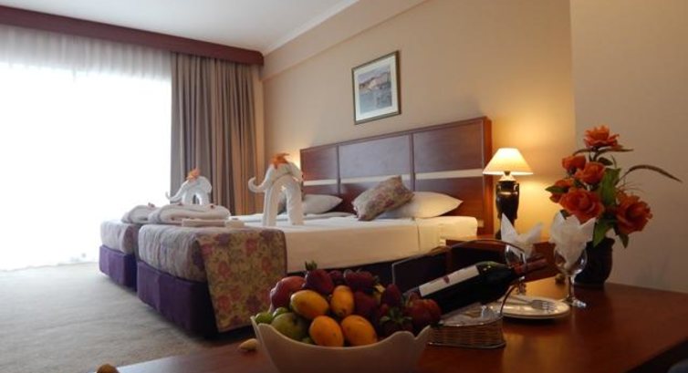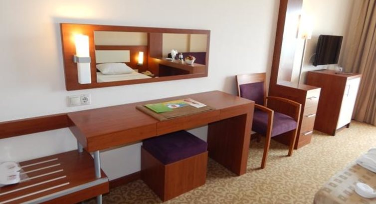 Приехали мы 25.05.2017. семья из 5 человек, на 9 ночей, нам сразу одели браслеты, сказали что через 10 минут обед и как раз после обеда в 14.00 нам дадут номер. Номер у нас семейный две комнаты, при получении номера на втором этаже, в каждой комнате на ковролине был мелкий мусор, в углу скомканая бумажка, кстати эта бумажка так и осталась в углу когда мы уезжали, убирали у нас не очень, да и кажется что не каждый день, по крайней мере мы этого не замечали, ну это не главное ведь мы приехали отдыхать, в каждой комнате по телевизору, много русскоязычных каналов, в каждой комнате холодильник, воду пополняли каждый день, два балкона, номер просторный, в одной комнате двухспальная кровать, в другой у нас спали дети, две полуторки и для третьего ребенка мы разложили кресло кровать, в ванной комнате шампуни, мыло, пополняли каждый день, правда пару раз была проблема с ножным полотенцем, уборщица его забирала, но взамен не ложила, пришлось оба раза обращаться на ресепшен. Так все понравилось, отель красивый, кормили вкусно, еды много, фруктов правда было мало, яблоки, апельсины, грейфрукты. Отдельное спасибо официанту который приносил нашим детям колу, а нам вино, (к сожалению не помню как его зовут) анимация понравилась, были и турки и наши девочки, но наши вялые были, турки молодцы, Жуниор вообще молодец! Кондиционер общий, в номере было жарко и он не справлялся со своей работай, дул обычным летним воздухом. На море ходили по подземному переходу, есть бар на пляже, там можно выпить соки, чай разный, кофе, алкогольные напитки, пицца, лепешки готовила женщина вкусные, так же можно покушать, в общем все классно, лежаков хватало, на первом этаже отеля также бар, и бар у бассейна там тоже можно выпить и покушать, вечером мини диско для детей, потом представление, в общем все понравилось, кстати по средам приезжает переездной рынок который начинается за нашим отелем, одежда, фрукты и т.д.