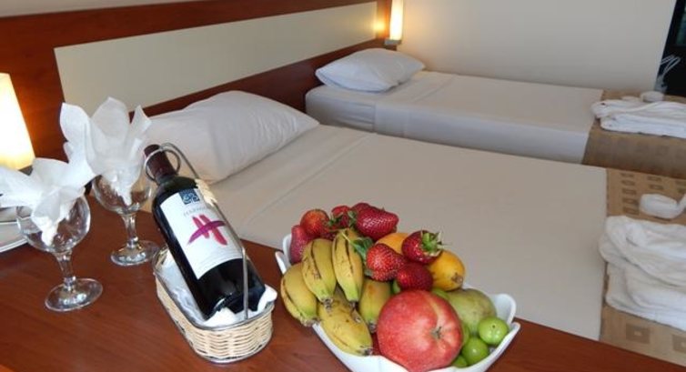Отдыхали парой в середине мая 2017. Заехали около 13.00, оставили вещи на рецепшене и пошли на обед. Кормят хорошо - очень много овощей в разных видах, курица, мясо, десерты и выпечка. После обеда заселили в номер. Номер понравился - просторный, большая кровать, диван, телевизор + куча каналов (в т.ч. российских), напор воды в душе просто сносит, лоджия с вешалками и пластиковой мебелью.