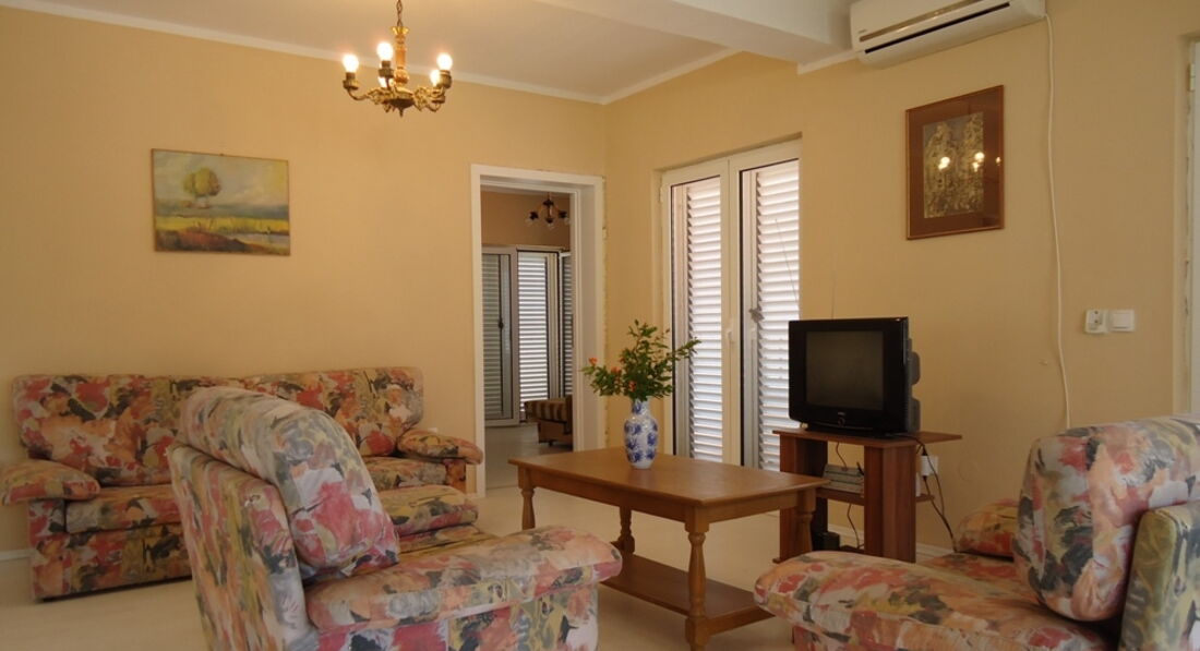 У VILLA: Світлі апартаменти, обставлені сучасними меблями, 4 спальні з французькими та роздільними ліжками, вітальня та 2 зали для відпочинку, обладнана кухня з обідньою зоною, 4 туалетні кімнати, велика тераса з видом на море, балкон. Посудомийна та пральна машини, кабельне телебачення, кондиціонер, посуд. Максимальне розміщення – 10+2 особи.
