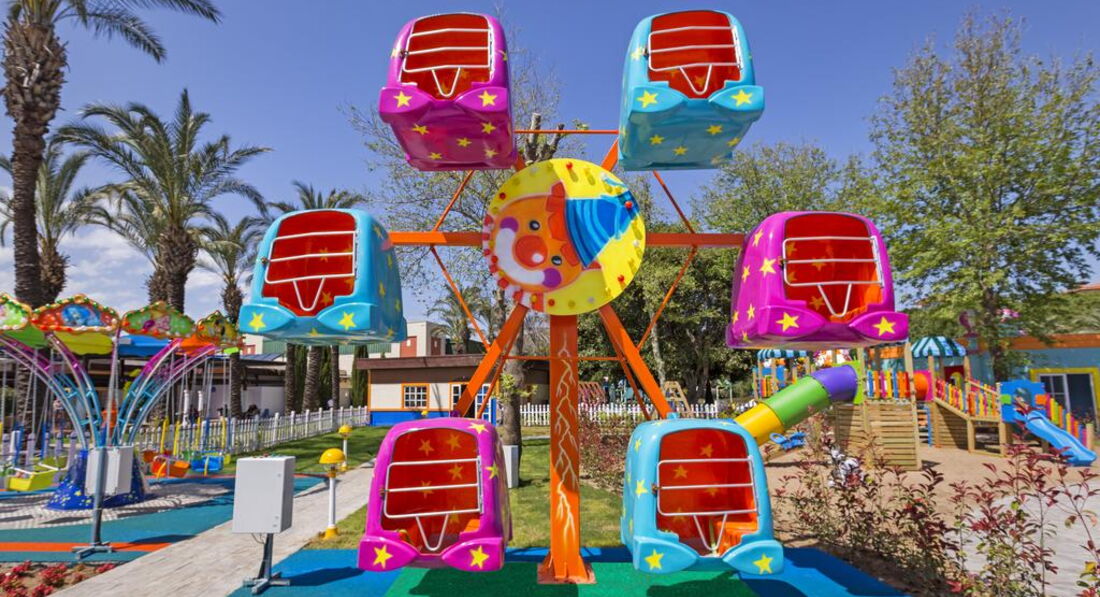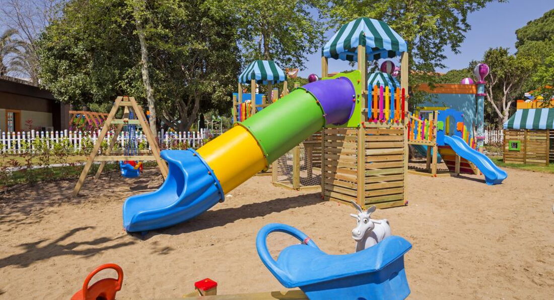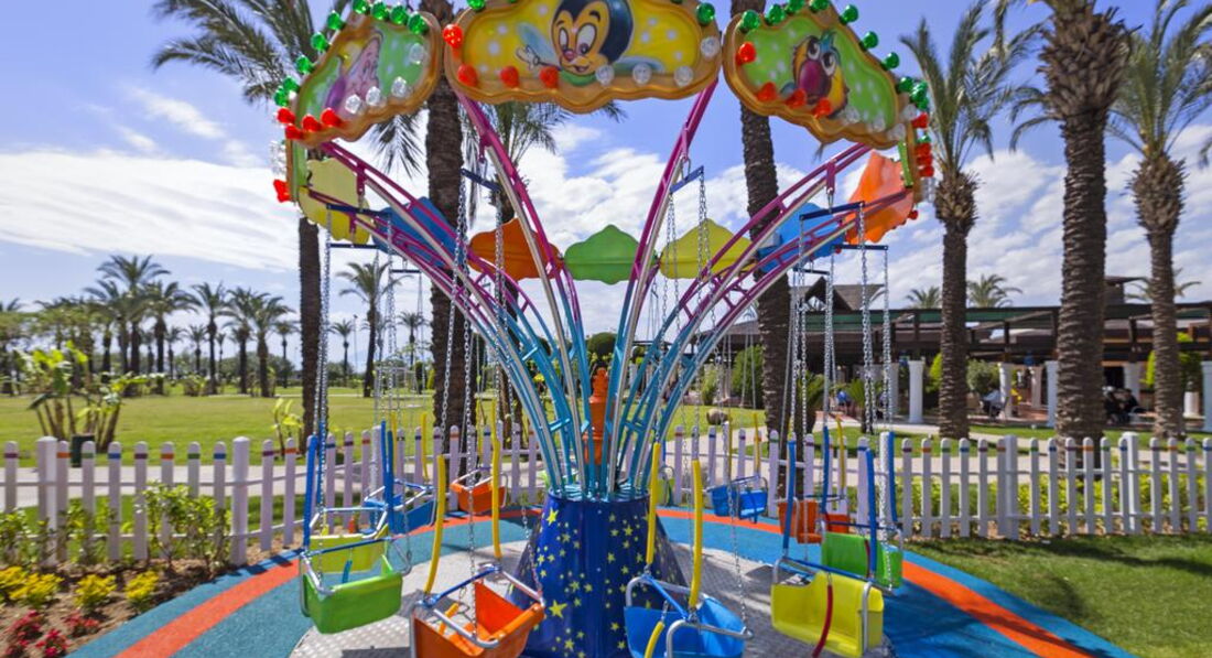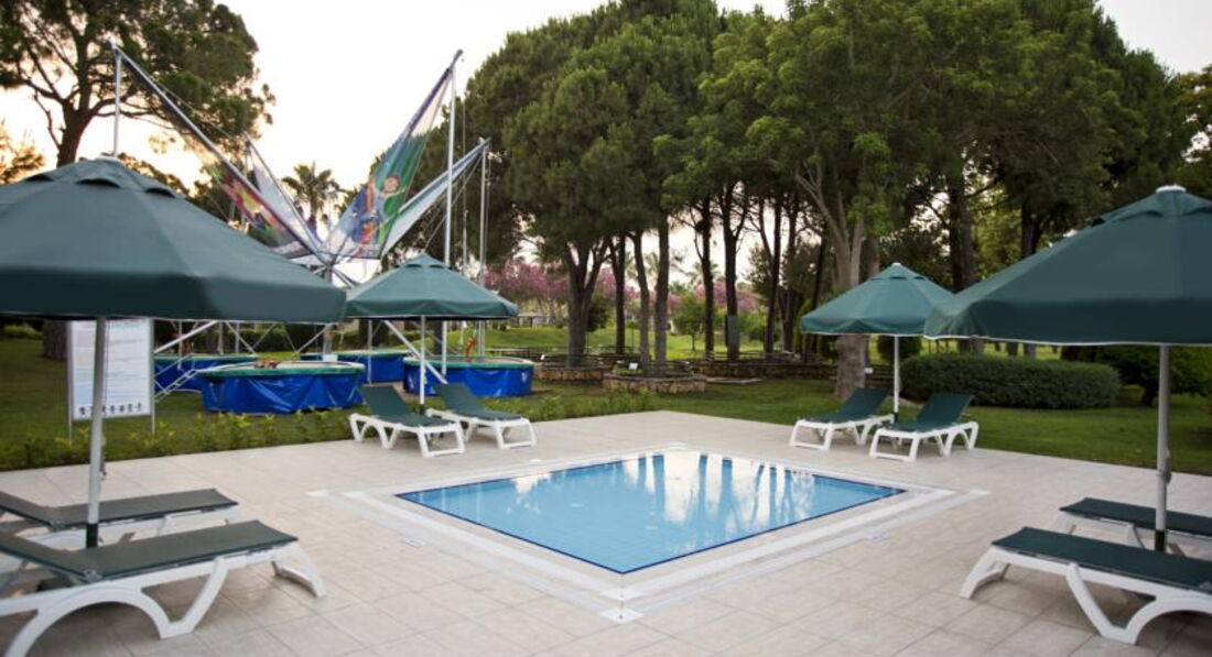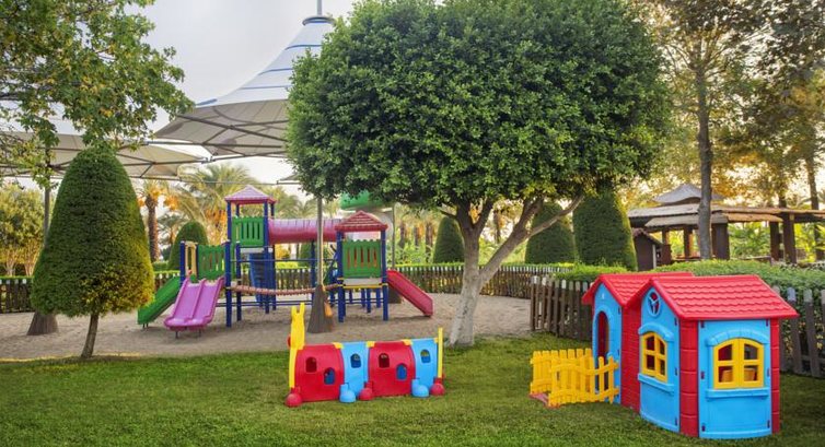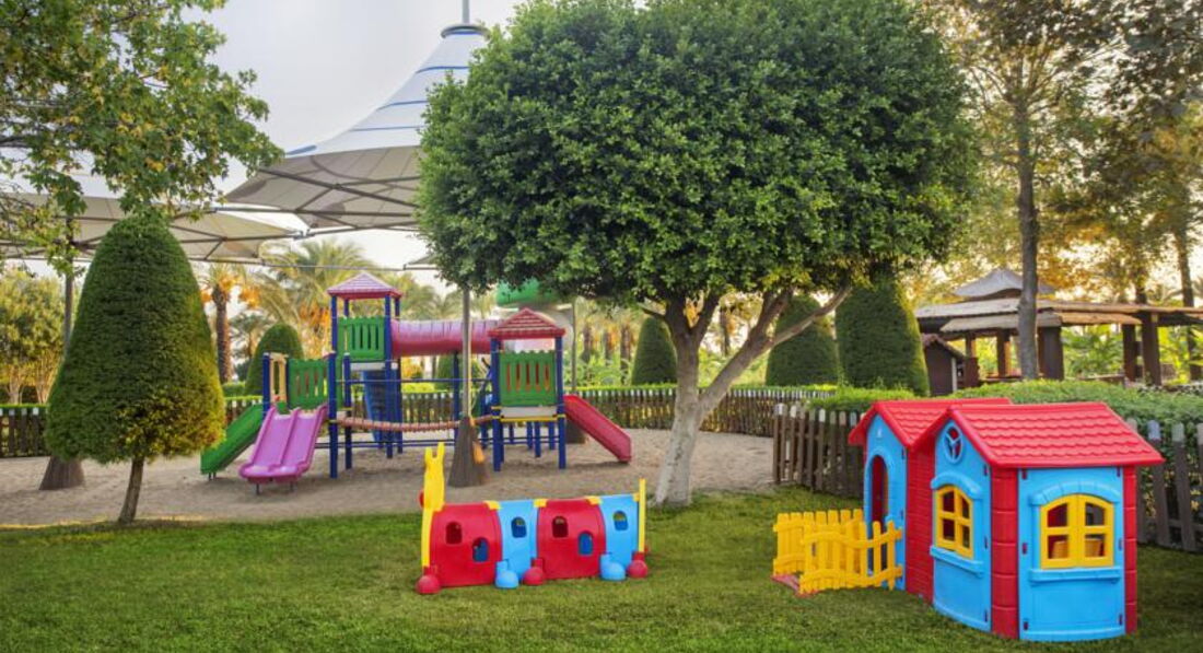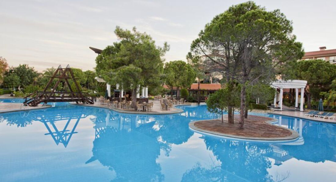 Для деток сказка нет подъемов и спусков с коляской без проблем можно добраться по всему отелю в пруду плавают лебеди и рыбы их можно кормить, зеленая большая территория. Красивая много деревьев, но ничем не отличающаяся от отелей в Белеке или в Текерова. Отель старый, зелени много действительно.