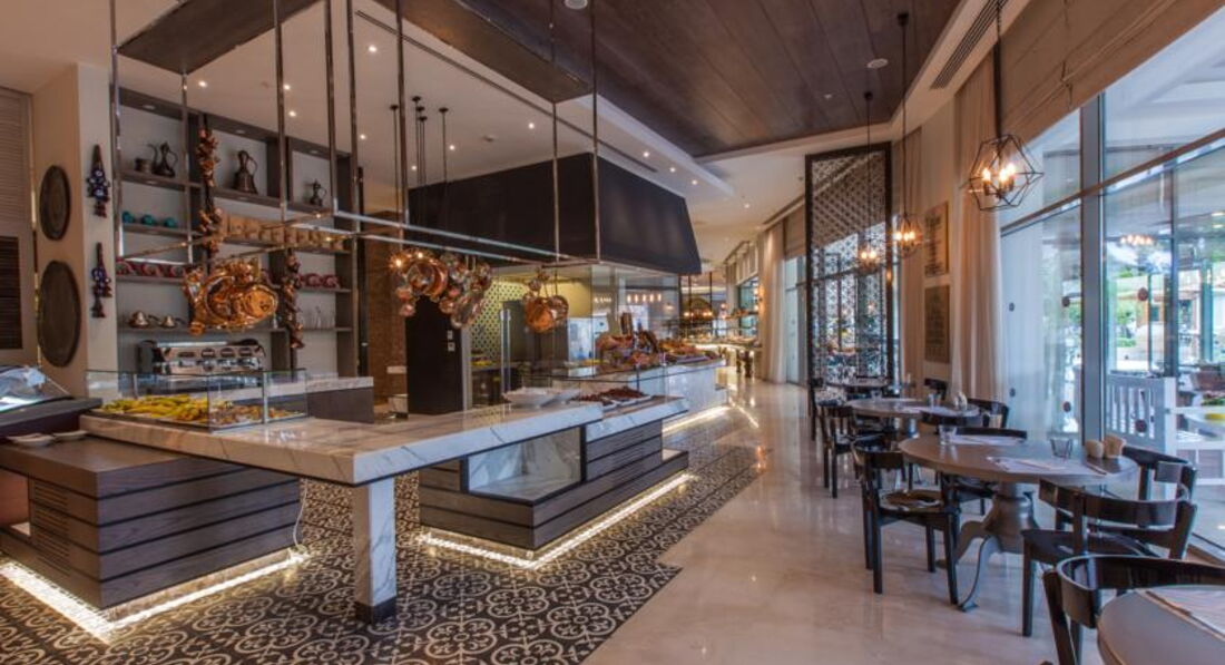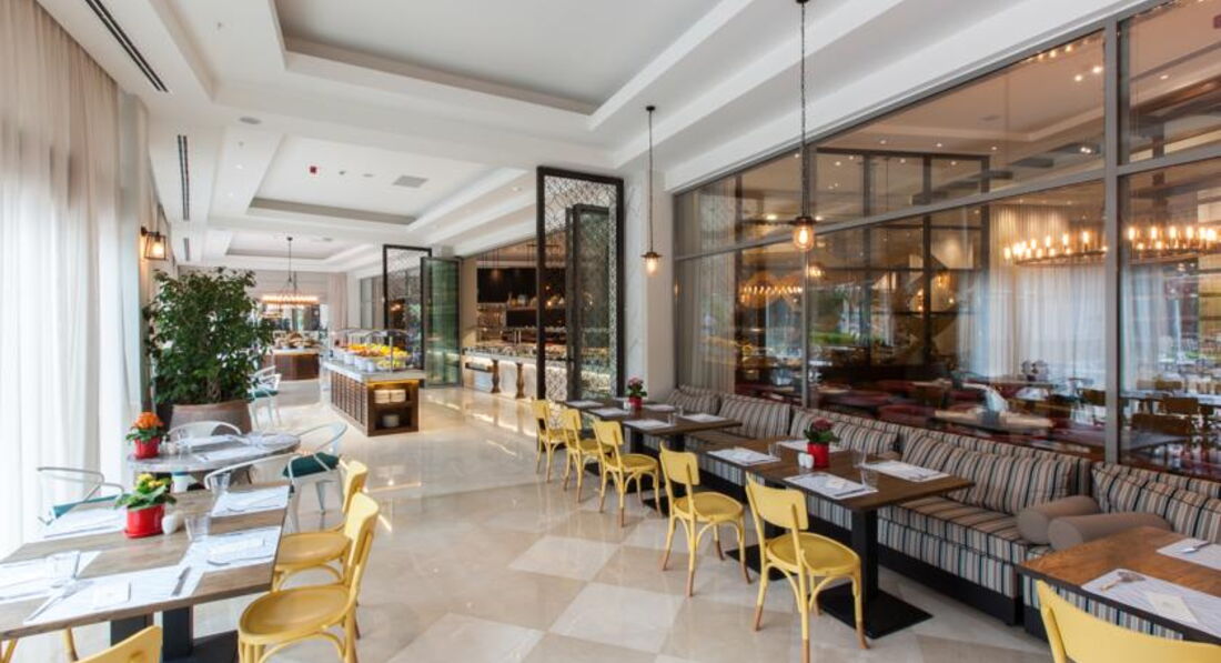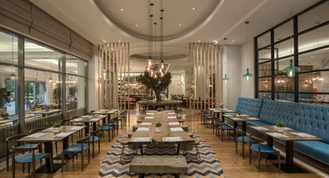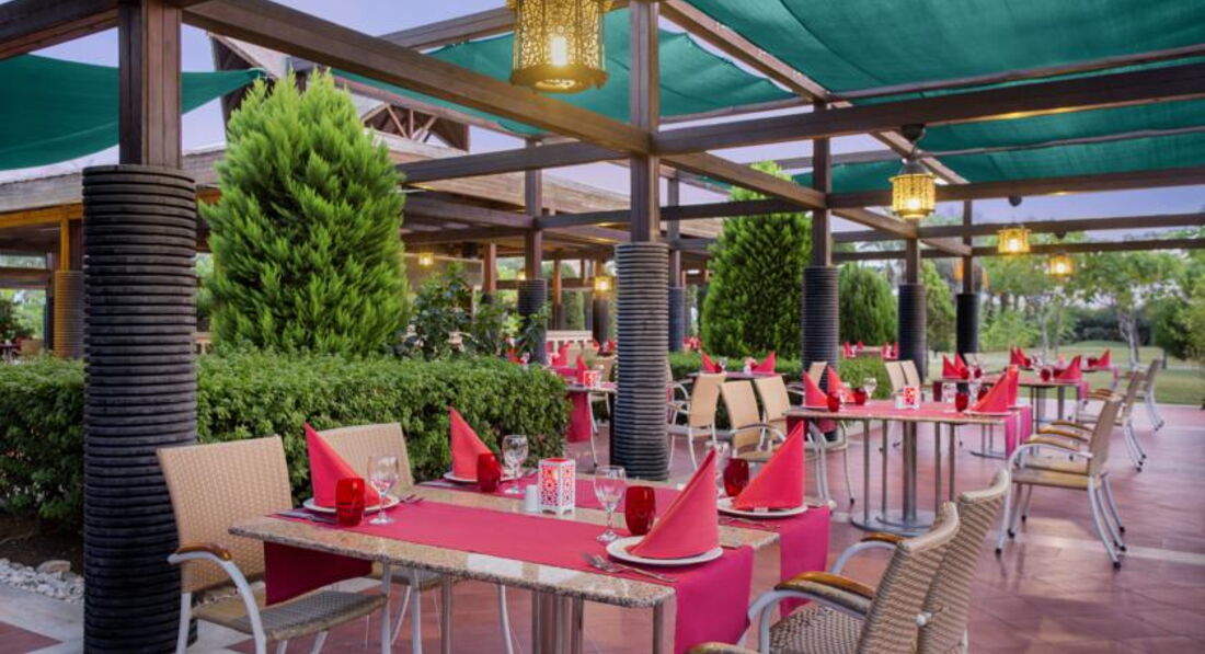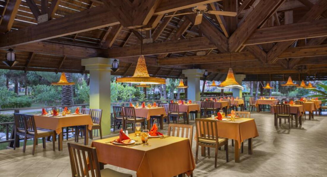 Бари та ресторани: головний ресторан розрахований на 800 осіб (критий, з кондиціонером, літня тераса, дитяче меню, дієтичне меню, дитячі стільці), лобі-бар (24 години), бар біля басейну (10:00-24:00), бар на пляжі (10:00-18:00), диско-бар (23:00-02:00), вітамін-бар (10:00-20:00) та ін. 6 ресторанів A la Carte: китайська, японська , італійська - платно; турецький, рибний, мексиканський - відвідування кожного ресторану безкоштовно 1 раз за час проживання, за попередньою резервацією.