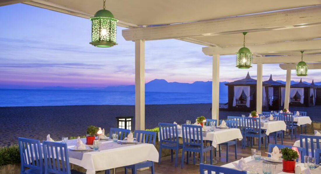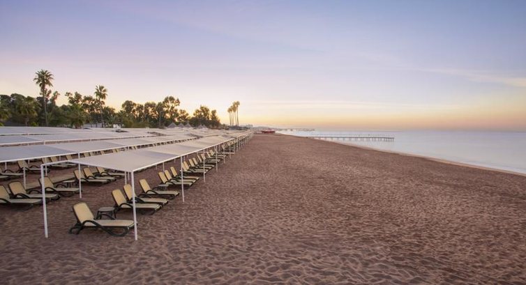 Итак, начнем сначала! Приехали в отель мы около 9 часов утра. Зная о раннем прилете, я положила поближе все купальные принадлежности, поэтому мы переобулись, взяли одежду и пошли на завтрак, где нас сразу поразило разнообразие фруктов (арбузы, дыни, персики, абрикосы, черешня (была каждый день в течение недели. Потом, видимо, кончился сезон, и вместо нее ежедневно стали давать инжир), слива, бананы ,яблоки, виноград), варенья (даже из баклажанов и арбузов), сыров (здесь просто рай для любителей сыра: на завтрак, обед и ужин такое количество видов сыра, что всё не перепробуешь). Удивила подача свежевыжитых соков: апельсиновый, яблочный, морковный (просто супер), арбузный, томатный. По запросу сделают смесь любых вкусов. Ну, и уже всем привычные на завтрак пончики, оладушки, йогурты, каши и т.п. В общем, после завтрака мы пошли на пляж, где переоделись и купались до 11.00 ,когда нам было назначено заселение. Море встретило нас очень ласково: теплое, абсолютно без волн и чистейшее. Пляж, я бы сказала, всё-таки грязноват, но здесь я хочу обратиться не к персоналу, а к отдыхающим: то, что вы приехали расслабляться, не даёт вам право становиться свиньями. Хотя те, кто оставляют окурки, стаканчики и даже пивные бутылки на пляже, где сами же отдыхают, наверное, свиньи по своей натуре, независимо от времяпрепровождения. Но не мне их судить!!! Вернемся к морю! На пляже есть вполне хорошие переодевалки, рядом с которыми находится детская площадка под тентом, в которой всегда есть игрушки, так что с собой везти ничего не надо. За площадкой раполагается холодильник с водой и холодным чаем в жестяных баночках. Бар на пляже есть, но он открывается в 11.00, и там есть только пиво и безалкогольные напитки, а такаже чай-кофе и пирожные. Здесь же в 12.00 открывается кафе, где есть пицца, бургеры и другие закуски. Мы всегда ходили в бар у бассейна (идти совсем не далеко), там все те же напитки, что и в лобби баре (перечислять не буду - они есть в концепции отеля ,скажу только, что их количество и качество очень сильно поразило и удивило - всё крайне превосходно). К пляжу есть одно лишь пожелание - по моему мнению, напрашивается еще один ряд тента - места для этого предостаточно (хотя я в этом деле не профессионал, конечно).