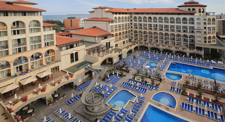 Были в отеле в начале июня (с 7-го числа) 2013 года. Подвела лишь погода и море - штормило (мелководье и купаться с волнами не комфортно, да и вода не выше 20 градусов). Отель - отличный. Прекрасное питание. Фрукты: груши. яблоки, ананасы, бананы, киви, апельсины, грейпфруты, сливы. персики. абрикосы, арбуз. дыня. клубника. черешня - три раза в день. Без ограничений. Все вкусное, спелое, свежее. Три бара - один у бассейнов, два в корпусах - огромный выбор спиртных и безалкогольных напитков вполне приличный. А если хочется какого-либо особенного вина, то пожалуйста, в магазинах цены на приличные болгарские вина от 7-8 левов ) - 200-250 рублей бутылка. Кроме того спиртные напитки , которые купили в Дьюти-фри выгоднее приобретать в болгарских магазинах. Для детей очень хорошая анимация - два раза в неделю "Кулинарная академия" - детишки пекли песочное пенье и пиццу. У бассейна с детской горкой - два специально обученных человека - один на горке отправляет детей, другой - внизу следит за тем, чтобы дети не скапливались у раструба трубы горки.