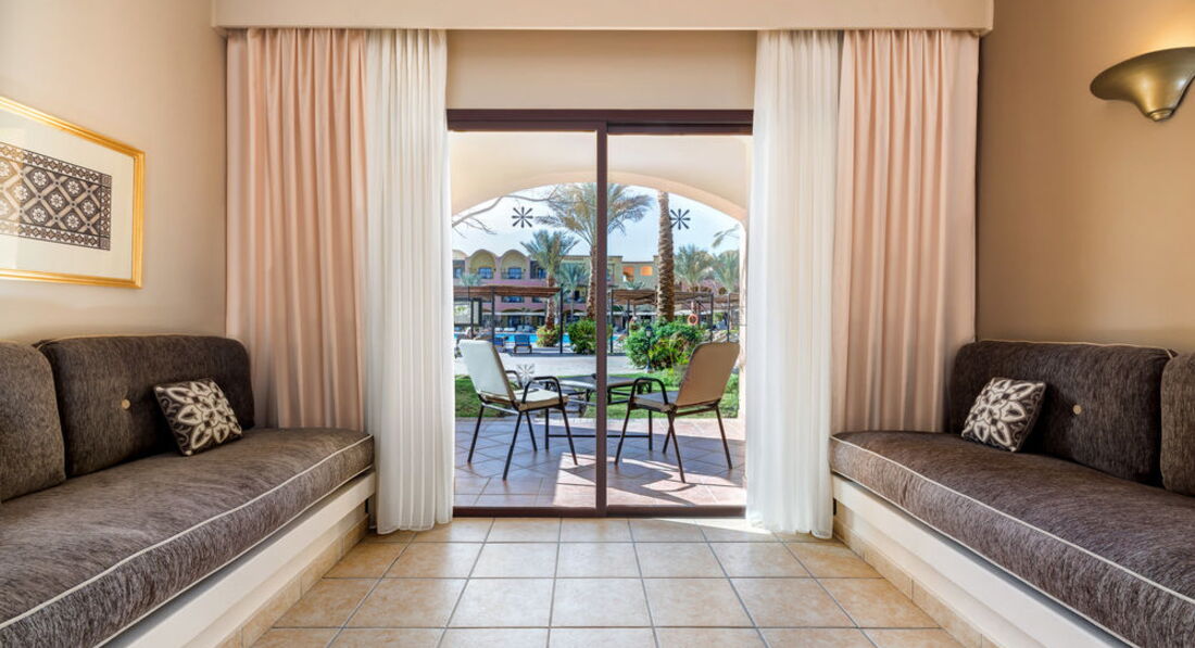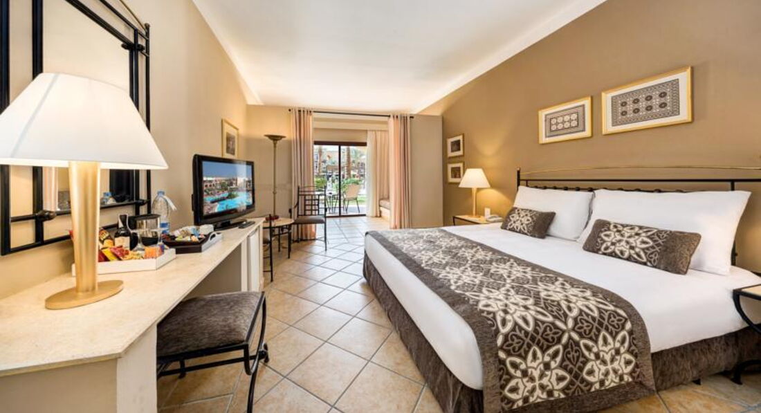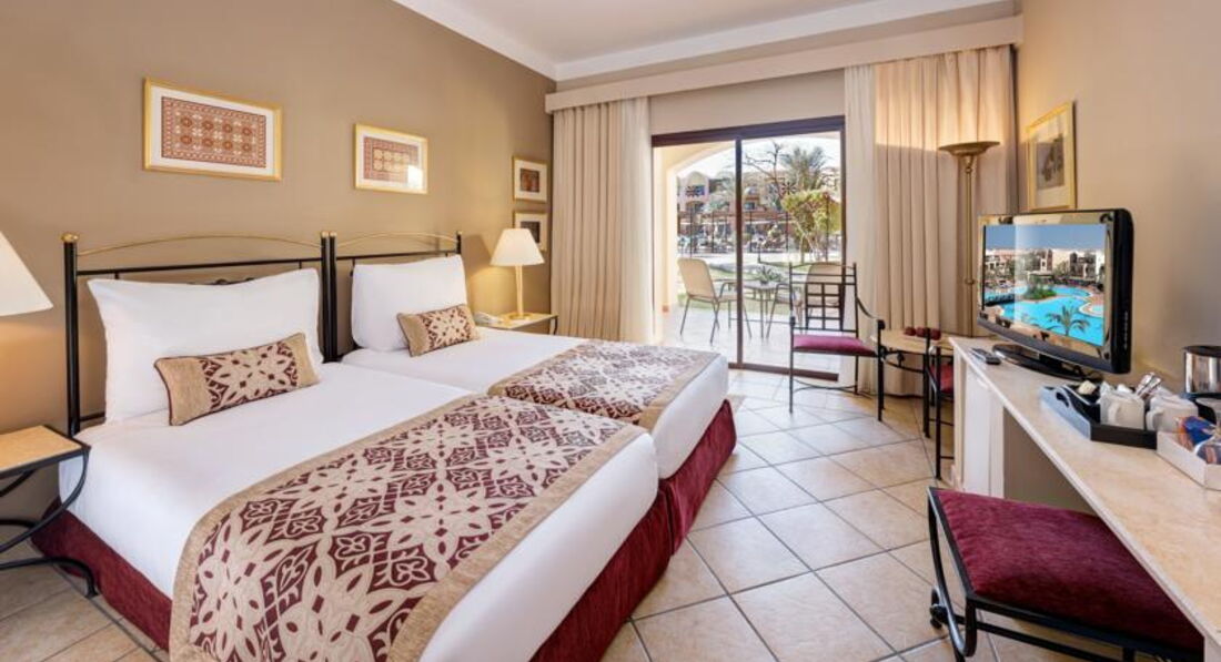 Мы семьёй обычно каждый год летаем на турецкие курорты, но в этом году, из-за резко поднявшихся цен на Турцию, решили впервые побывать в Египте. Конечно это явный контраст, хоть мы и не ждали слишком многого, но всё же разница чувствовалась во всём. Начну с самого грустного, это номерной фонд. Прилетели мы рано, хорошо, что заселили быстро и без проволочек и доплат. Номер у нас был забронирован с видом на бассейн, но после первой же ночи мы попросили нас переселить, и дать хотя бы второй этаж. Ощущение было, что спим на проходной улице, шум и анимация нам не давали уснуть, так как в первый день вымотались, и хотелось выспаться. Нас переселили в тихое место, с видом на сад. Само расположение оказалось лучше, а вот номер с далеко не новой мебелью, обстановка старенькая, но всё хотя бы работало. Полотенца меняли каждый день, постельное пару раз, с уборкой плоховато, терпимо, но с натяжкой. Я так поняла, что убираться в этой стране просто не умеют, или не хотят учиться. Повозили тряпочкой, смели в видных местах пыль, ну и ладно. За уборку ставлю минус, а в остальном вполне хороший сервис и отношение к гостям в отеле. За смену номера денег не взяли, продлили номер до позднего вечера без проблем, официанты и бармены улыбчивые, со своими задачами справляются. На ресепшне тоже не возникло недопонимания, помогали всегда, чем могли. Но вот гид от туроператора в отеле просто не нужен, по-другому и не скажешь. Узнать информацию никакую не возможно, только продажа экскурсий по очень завышенным ценам. Нашли отличную стоимость у Mido Bikham его самого несложно найти по имени в любом поиске или же в социальных сетях. Вышло раза в три дешевле чем брать в отеле. Ездили в Луксор была просто потрясающая экскурсия все очень интересно. Комфортабельный транспорт плюс оплачивали в автобусе при выезде из отеля а не какие то там предоплаты. В общем все очень понравилось. Так же есть некоторые недостатки в питании, и особенно в напитках, как алкогольных, так и нет. Соки только пакетированные, а те, которые мы не видели, как наливают, сильно отдавали хлоркой и были порошковые на вкус. Фреши можно только купить, и стоит стакан 3 евро. Из алкоголя пили только вино, и лучше брать красное, белое нам вообще не понравилось. Более крепкие напитки только так называются, весь алкоголь местный и соответствующего качества. Можно так же купить импортный, но и он нас не впечатлил. Питание довольно неплохое, и если что, можно сходить в несколько а-ля-картов. Ребёнок у нас уже немного вырос, поэтому с едой было попроще, но всё же не такое обилие и качество, к которому уже так привыкли. Хотя и рыба, и мясо всегда были в хорошем качестве и количестве. Овощи, фрукты, всё свежее, хотя к местному вкусу и специям пришлось пару дней привыкать. Но официанты молодцы, провожали и находили свободный столик, приносили заказанные напитки, и убирали посуду и приборы вовремя, и вообще не навязчиво. Из понравившегося пляж и само море, оно чудесное. До пляжа придётся пройтись минут 5-7, но по приятной тенистой алее. Вход пологий и песчаный, купались не боясь порезать ноги, есть и свой риф красивенный, много рыбок и прочей живности, есть на что поглазеть, конечно ни в какое сравнение с средиземным морем. Территория тоже ухоженная, много зелени, чистые бассейны, и отличный аквапарк, катались всей семьёй. В целом, от отдыха остались 