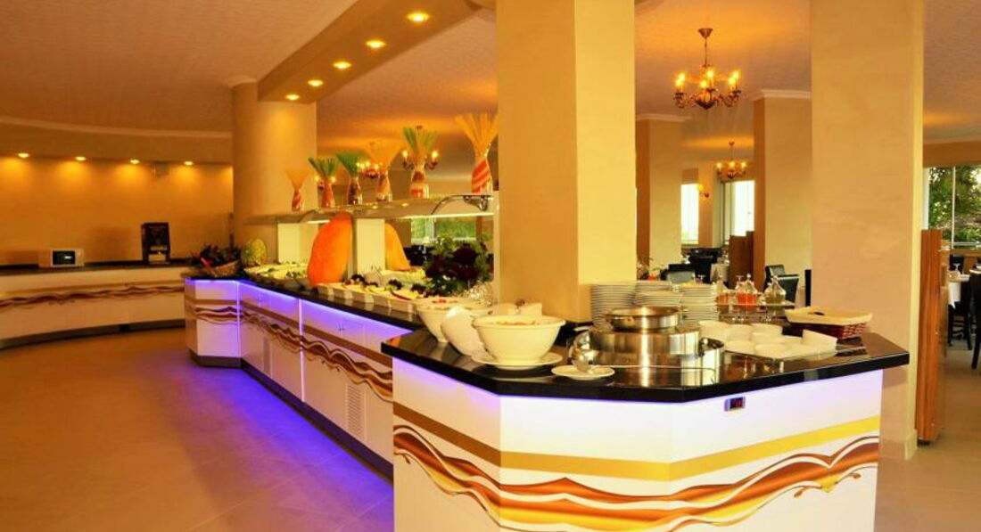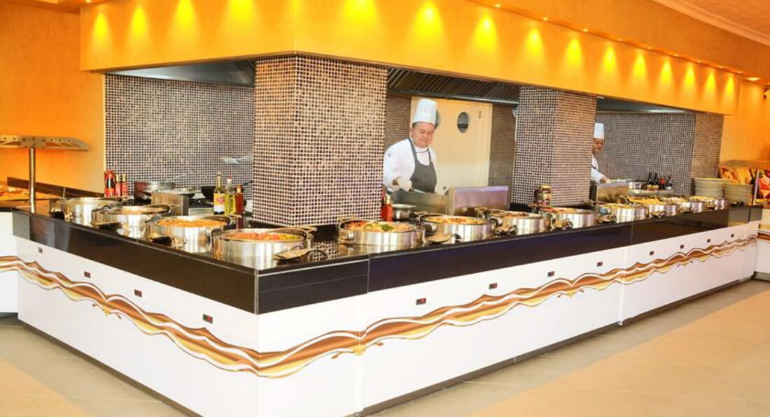 Питание в отеле отличное,всего много и очень вкусно,много фруктов,мясо разнообразное,овощи в изобилии,десерты,мороженое.Официанты работают отлично,шустро убирают со столов,наливают напитки,если что-то пролили или уронили сразу же убирают.Каждый прием пищи шеф-повар присутствует в зале и все сам контролирует.Ресторан большой,места и посуды всем хватает,персонала очень много.С 14 до 16 в баре у бассейна готовят пиццу,,гамбургеры,картошку фри,с 17 до 18 час там же чай с печеньками. Что меня удивило и показалось неудобным-чай и кофе в ресторане есть только в завтрак,в обед и ужин кофемашины не работают,то есть десертов полно,а кофе-чая-кипятка нет!!!Только если в бар сбегать этажом ниже