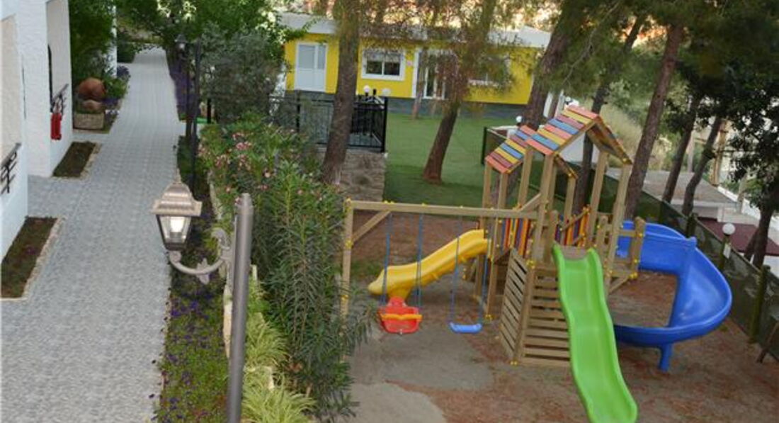 Территория отеля красивая и ухоженная, стрекочут цикады, кругом сосны и зелень.Прелесть.Есть детская площадка, два детских бассейна(не подогреваются), в одном из них горки(он возле нашего корпуса был через дорогу), но работают 2часа в день, мы не успевали.