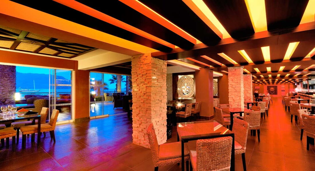 Бари та ресторани: головний ресторан розрахований на 1000 осіб (критий, з кондиціонером, літня тераса, дитячий стільці), лобі-бар (24 години), бар біля басейну (10:00-18:00), бар на пляжі (10: 00-18:00), диско-бар (22:00-04:00, напої після 24:00 - платно) та ін. 2 ресторани A la Carte (20:00-22:00): міжнародний, рибний - безкоштовно 1 раз за час проживання за попередньою резервацією.