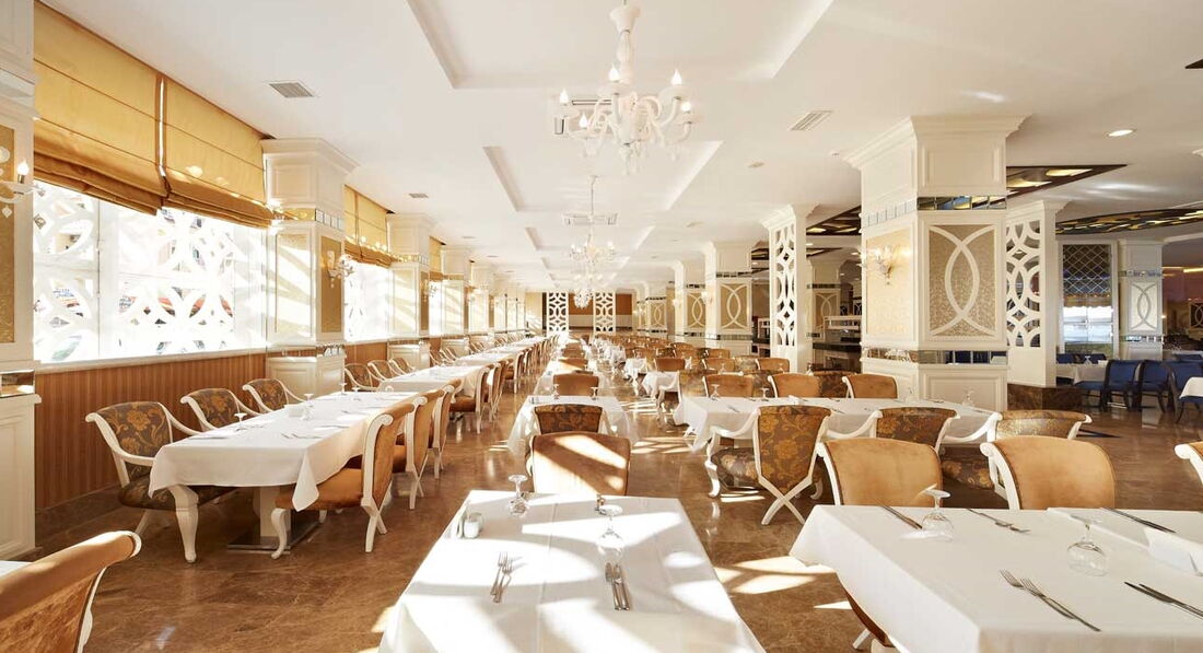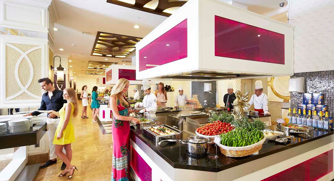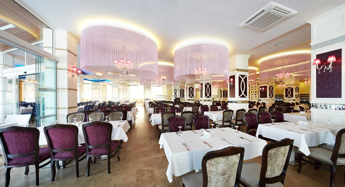 Прекрасная ухоженная территория, несколько уютных баров и кафе. В ресторане достаточно разнообразное меню, много овощей( свежих,варёных, жареных, на гриле). На завтрак пекут вкусные блинчики и вафли. На обед и ужин всегда есть рыба, курица, индейка, баранина. Из фруктов- яблоки, апельсины, сливы, арбуз и дыня. Вкусное мороженое. В "турецкую ночь" приятно порадовал шоколадный фонтан, сладкая вата... Есть отдельная кондитерская, где можно выпить чашку кофе или чая с турецкими сладостями. Персонал очень доброжелательный. Несмотря на то, что отель был заполнен на все 100 %, обслуживали быстро ( по крайней мере нас :-) ).