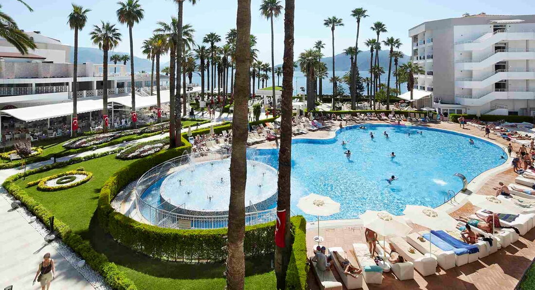 Все здорово, только вот море холодное, езжайте в июле или в августе. Отель красивый, с высокими пальмами из далека их видать) пляж узкий ,есть пирс , мест не хватало( Два бассейна, территория не очень большая, но и не маленькая, два бассейна , один с горками. Если бы ехали с детьми наверно они бы только там , клуба для детей нет. Мы прокатились один раз и нам этом хватило. В Мармарисе сидеть в отеле не стоит, там нужно гулять, кататься на велосипеде, что мы и делали . Уж очень там красиво!! Мармарис и Ичмелер сказака! Посетили черепаший пляж , до него ехали на катере по реке Дальян , любовались природой , видели наскальные гробницы, так же отдохнули в термальных источниках ,помолодели лет на 10)))) Накормили крабом с пивом-супер. Муж даже сам краба поймал.Рекомендую эту экскурсию! Вам понравиться.