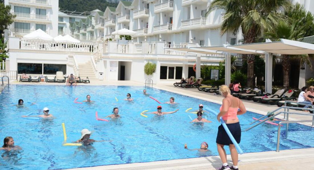 - Анимация (турок Али) в основном для детей, для взрослых недостаточная (нет йоги, утренней пробежки, восточных танцев, дискотеки, а только элементарная зарядка). Есть аквааэробика (смешной вариант с массажем соседа и т.д.), дартс, водное поло.