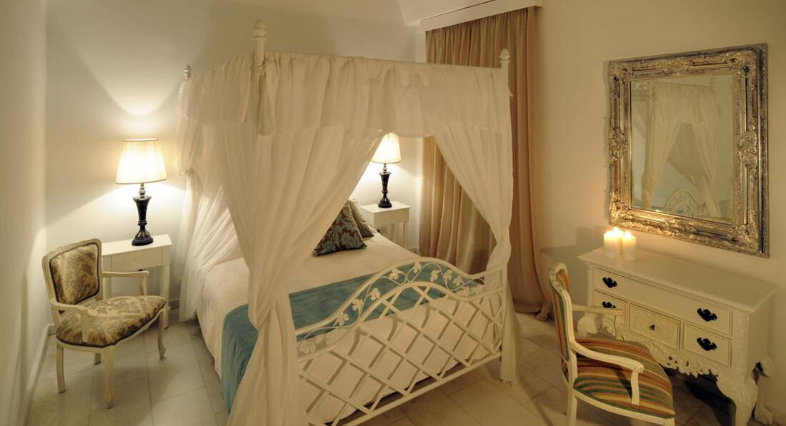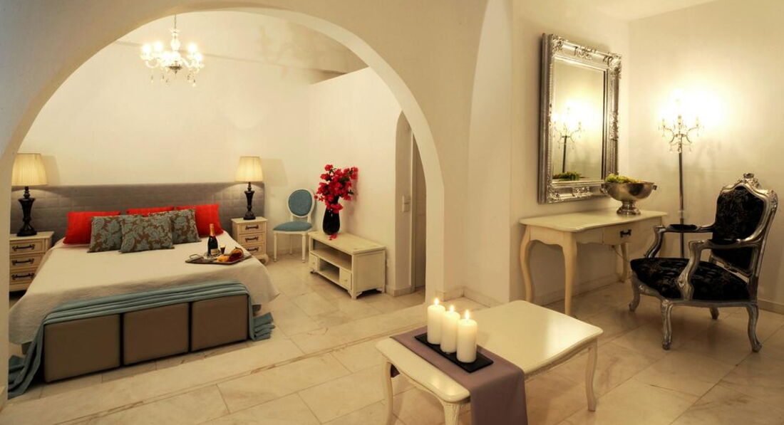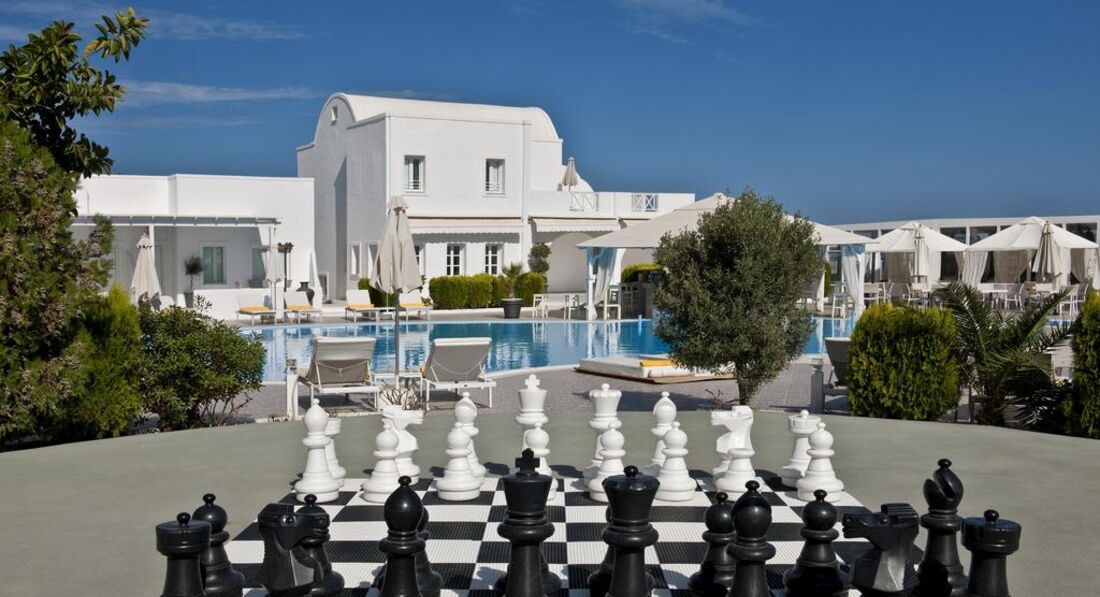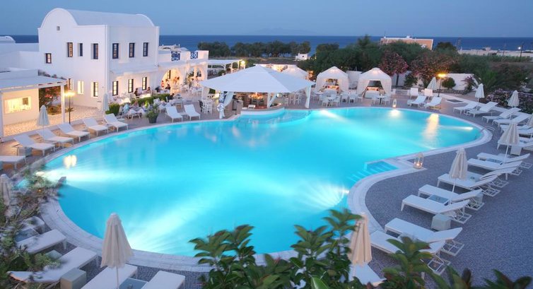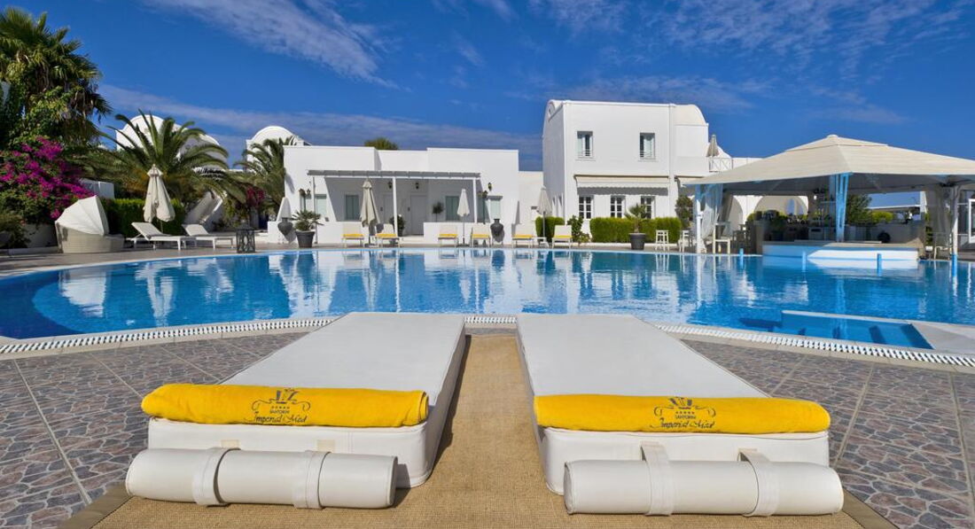 Готель Imperial Med розташований на відокремленому пляжі Aghia Paraskevi на екзотичному грецькому острові Санторіні. Побудований у стилі традиційної архітектури Cycladic. Нещодавно був повністю відремонтований і є чарівною сумішшю витонченого білого мармуру в переплетеннях внутрішніх квітучих двориків на яскравому тлі темно-синього неба та моря.