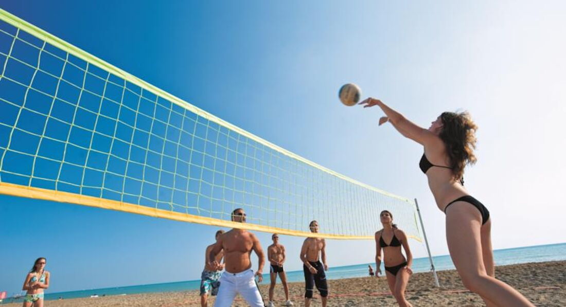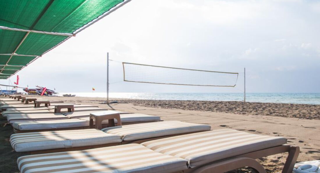 На пляже есть бар с закусками и полноценным завтраком и обедом, работает он кажется с 8-30, напитки там так же наливают. На самом пляже есть площадка для волейбола, отдельная зона под навесом для занятий йогой (спасибо Светику за эту утреннюю гимнастику), пока мама на зарядке, дети могут поиграть в боччу (спасибо Женечке). В туалете на пляже, как и во всех туалетах около бассейнов, есть детский туалет, очень удобно для юных гостей