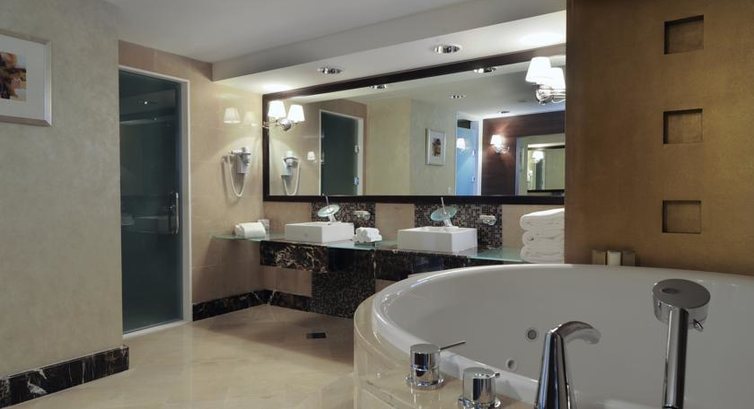 Номер нам дали на третьем этаже с видом на город. Из преимуществ номера в первую очередь нужно отметить, что напротив через холл находится вход в ресторан, где нам было предложено питаться и выход к бассейну. В номере – просторная прихожая, переходящая в достаточно большую комнату, в которой вы найдете большой комод с ящиками, мини-баром и широкоэкранным ЖК-телевизором, письменный стол с настольной лампой, телефоном и точкой бесплатного Wi-Fi доступа и платного скоростного интернета по выделенной линии, просторный платяной шкаф с встроенным электронным сейфом, большую двуспальную кровать с прикроватными тумбочками, на одной из которых находится пульт управления кондиционером и освещением в номере, диван с подушками в зеркальной нише стены напротив окна и большое кресло с отдельно стоящим пуфиком для ног у окна. На полу номера – мягкое ковровое покрытие. В ванной комнате – просторная душевая кабина, умывальник, унитаз, туалетный столик, халаты и мягкие тапочки. Кроме всего прочего, в распоряжение гостей номера – чайно-кофейный набор, расположенный в специальной нише у дивана, гладильная доска с утюгом. Смена постельного белья и уборка номера производится ежедневно.