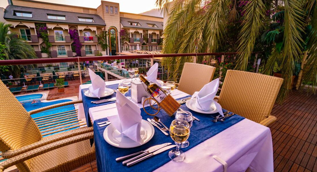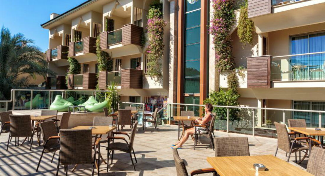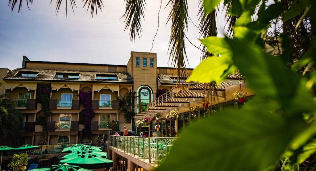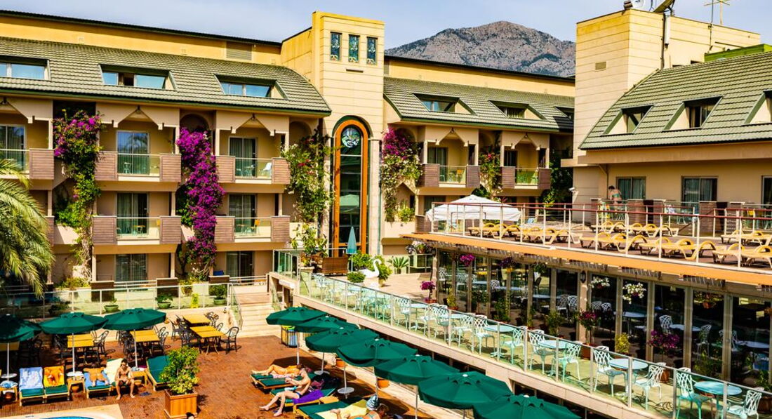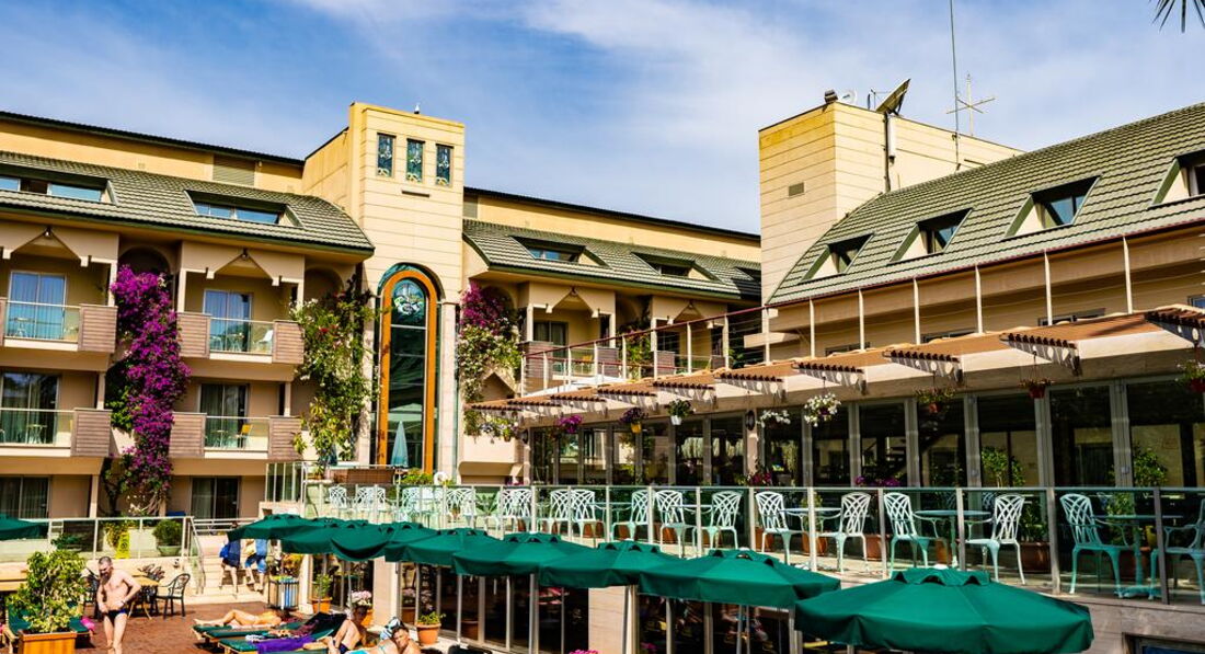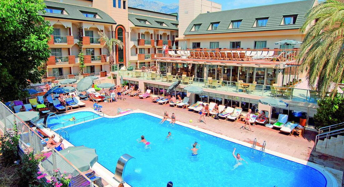 Були того року у липні,чесно сказати чудовий отель хоча і не дуже великий,після тяжкого робочого року,потрібно було гарно відпочити і саме тут це вдалося.Готель-оскільки ми приїхали раніше до поселення нам довелось ще чекати 3-4 години щоб нас заселили у номер,ну добре,залишили речі у камері схову і пішли на пляж.Номер-був охайним і все взагалі було чудово,гарне кондиціювання та вихід на балкон,сильно на балконі кави чи чаю не поп єш бо спекота що взагалі..., є холодильник у номері(не міні бар),чудові ліжка з ортопед матрацами,хоча не всі розкладний диван у номері був твердим та жортким(номер 2+1) спати було складно+кондиціонер дув саме туди,але сильно критично це не вважайте просто кажу як є.Прибирали кожні 3 дні,чудові жіночки,а якщо залишите хоч 1 долар то вам і лебедів зроблять з рушничків(але то вже за вашим бажанням) Їжа:широкий вибір всього чого хочеш,риба,м ясо,десерти,напої(пиво,вино,кола,фанта,спрайт ну і звичайно розведені соки як і у всіх туркіш готелях,ох ці халтурщики=))Щодо ранку,то як завжди-пластівці,соєві ковбаси,сири,булочки,оливки та маслини,омлети і тд.Також були так звані перекуси о 16 00-всілякі випічки які можна скуштувати з кавою чи чаєм.Пляж-перейти дорогу і ви на пляжі йти 2-3хв,у чому -,те що людей в готелі більше ніж місць на пляжі,всі раненько позаймають лежаки і потім дзуськи не ляжеш якщо прийдеш після обіду чи в 11-12,хоча там ходить мужчинчик і просить забирати всі речі,але наші люди всюди,як говориться,ніхто впринципі сильно уваги на його не звертав,на пляжі можете собі зробити чаю,там є спеціальні контейнери де є гаряча вода з пакетиками,трохи халтурили з цукром,бо він там весь був хоч і у пакетиках,але весь дубовий(старий певне..)що висипати його було неможливо,але то таке друбниці.Море-то щось неземне,просто чудове,тут нема що додати,релакст просто вауу,доречі деякі хлопці з масками навіть зловили декілька восьминогів+з лівого боку там є пір іншого готеля куди можете зпливати і попригати звідти там також круто,шкода що ми тути пішли перед самим від*їздом,бо та мдійсно так гарно,панорама на прибережну лінію дуже гарна=)))(Головне,якщо вас спитиють що ви з їхнього готелю просто скажіть браслет у номері залишили=)))Місце розташування-5 хв до центру,там ви знайдете всілякі магазинчики,обміни валют а також пір звідки йдуть корабельчики + важлива інформація!!!Кожний вівторок там проходить ярмарка,це зможете купити за нормальними цінами товари,а якщо щей поторгуєтесь то взагалі,бо у магазина у 2-4 рази все те саме дорожче ніж там)Обов язково купіть якісь тканинні вироби,покривала і тд та оливкову олію,бо там їх роблять якісно=)Тури-не веріть в отелі у 2-4 рази дорожче ніж у інших продавців за межами(тіж туроператори накручують ж на вас гроші у самому отелі,вас спеціально з групою поведуть у конференц зал і будуть втирати як там у них все на висоті і все таке,не вірте ,підіть походіть і дізнайтесь ціни за межами там не гірше повірте,дивлячись по відгукам інших людей).Загальне враження-Розслабились на ура,чудовий доречі краєвид коли ви запливаєте далеко,пальми і готелі та прибережна лінія з горами це щось,отримали масу задоволення.Так що якщо ви читаєте погані відгуки не видіться,бо позвикали всі до 10 зірок ал інклюзіва і їм все не подобається,тьфу на вас з цим менталітетом.Так що їдьте і не думайте.Ми круто відпочили і вас також б