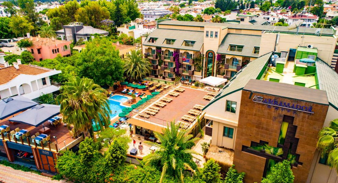 В Ambassador отдыхали 2-й раз в 3 корпусе с 24 мая по 6 июня 2017г.. Первый раз в 2010г. В Турции была большое количество раз, более 20. Кроме Турции отдыхала на Кипре, в Испании, в Арабских Эмиратах, Германии. Это к тому, что есть с чем сравнить. В 2010 году отдыхали взрослой компанией из 4 человек (парами) и все остались довольны. В 2017 отдыхали также компанией. В отеле произошли изменения, особенно в контингенте отдыхающих. Раньше здесь преимущественно отдыхали немцы, французы, шведы и небольшое количество россиян. Теперь здесь отдыхают россияне, украинцы и появились отдыхающие из Казахстана. В целом, отель положительное впечатление не изменил. Отель рассчитан на спокойный отдых. Анимации в отеле нет. Все подробно описывать не буду, все это есть в предыдущих отзывах. Остановлюсь на некоторых моментах. Номера, питание и сервис вполне устроили. Кому то там в отзывах не хватило в мае фруктов, так вот: арбузы,дыни,яблоки и апельсины давали каждый день на завтрак,обед и ужин. Клубнику и черешню мы покупали на рынке за 2-2,5$; за кг.Уборка номеров ежедневная и качественная. Персонал отзывчивый. Особенно хочется отметить администраторов на ресепшен: Ахмета (турок) и Дильбару (девушка из Киргизии). Оба говорят по русски и очень приветливые и отзывчивые. С каким бы вопросом к ним не обратился, с улыбкой обязательно решат все ваши проблемы. По поводу интернета: бесплатный интернет предоставляется 300 Мб на человека. Т.к. нас было двое (муж), у нас было 600 Мб на двоих. Интернет работал хорошо, только мы сначала никак не могли подключиться и обратились на ресепшн. Девушка (Дильбара) нам настроила планшет, объяснила под каким паролем входить и все, проблем с интернетом не было. Мы отдыхали 2 недели и мои 300 Мб закончились за неделю. Мне их хватило на просмотр несколько раз в день новостей, прогноза погоды, эл. почты, общение по Вайберу (с передачей фото) . Во вторую неделю мы использовали Мб мужа. Других целей для интернета мы не ставили, т.к. находились на отдыхе,а то, что было, нас вполне устроило. Пользовались услугами СПА, а точнее ходили на массаж. Массажист Алла (наша соотечественница) очень хороший, профессиональный специалист. Очень советую. Места на пляже хватало всем. В этот раз нас порадовал шоппинг. В Кемере открылись сетевые магазины одежды De Facto и LC Waikiki в которых цены вас приятно удивят. За 5$ можно купить приличную рубашку или футболку. За 10-20$ неплохие джинсы. Я себе купила приличную летнюю юбку за 6$. Также открылся обувной магазин Flo, где большой выбор летней обуви, особенно мужской. Эти магазины к оплате принимают, как доллары, так и евро, но сдачу дают только в турецких лирах, но по очень выгодному курсу. Выгоднее, чем в обменниках. Все эти магазины находятся в центре Кемера,, недалеко от башни и работают до 22 часов. Рынок овощи-фрукты в Кемере по понедельникам, тряпичный - по вторникам. Отдыхом остались довольны и если еще будет возможность поехать в Турцию, обязательно вернусь в этот отель. И хотелось бы обратить внимание некоторых товарищей, которые пишут о незаслуженном рейтинге отеля. Рейтинг отеля формируется из таких показателей, как: благоустройство номера и территории, питание, сервис, отзывчивость и доброжелательность обслуживающего персонала, а не из того, что кому-то там скучно. Ну, уж если вам в Турции скучно (вокруг полно дискотек и ночных клубов), то я не знаю, ку
