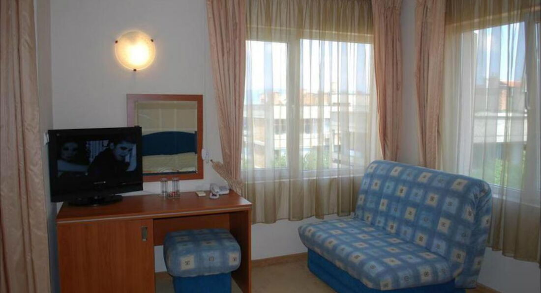 Размещение отеля очень удачное, улица тихая, кафе много, сувенирные магазины рядом (из кафе сразу хочется порекомендовать кафе Александр, расположенный на той же улице: вкусно, богатый выбор блюд, порции большие, обслуживание хорошее, цены ниже чем в соседних заведениях). Но! до пляжа точно не 200 метров, пришлось прогуливаться несколько дальше... Шезлонги и зонтики по 8 лев, на своих полотенцах можно лежать только на специально отведенных узких полосочках песка между некоторыми пляжами, свободные места придется еще поискать...