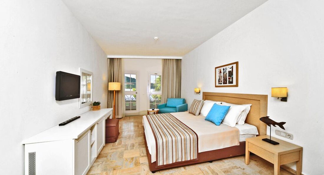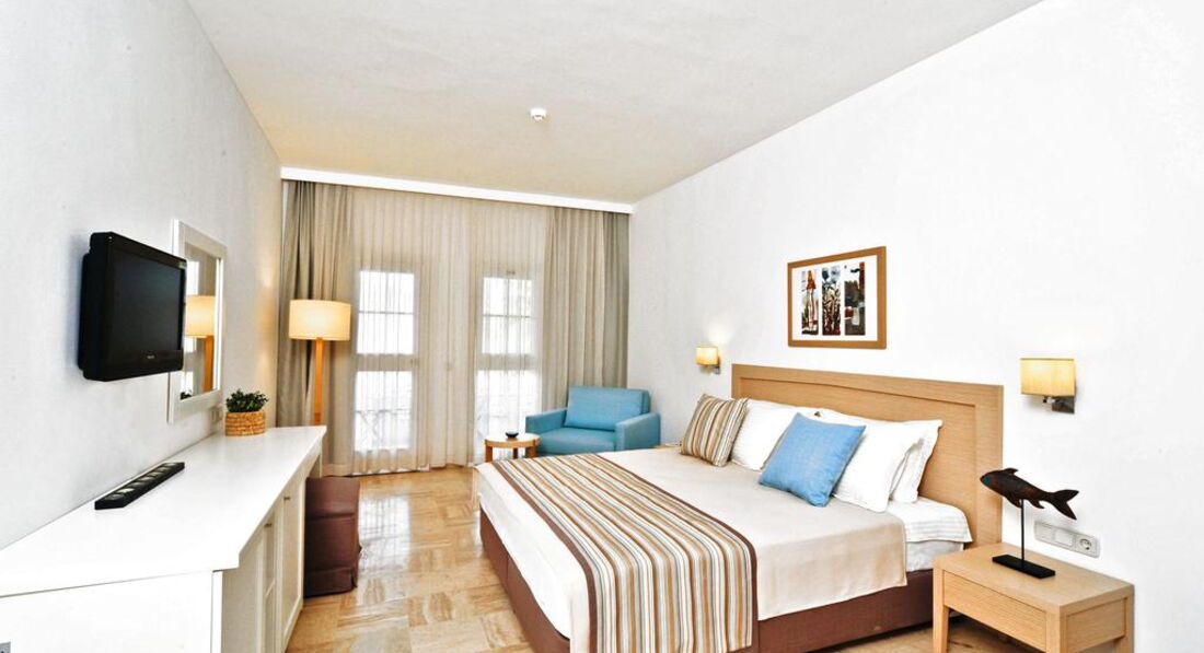 Територія та послуги: Відкриті басейни: 3 Дитячі басейни: 2 Критий басейн Водні гірки: 2 Ресторани A la carte: 2 Бари: 4 Конференц-зал (макс. 80 чол.) Магазини Лікар (платно) Пральня (платно) Хімчистка (платно) Розваги та спорт: Анімація Тренажерний зал Тенісний корт Настільний теніс Більярд (платно) Волейбольний майданчик на пляжі Баскетбольна площадка Водні види спорту (платно) Віндсерфінг (необхідна ліцензія) Дартс Бочча Аеробіка Салон краси (платно) Масаж (платно) Сауна Хамам Для дітей: Дитяче ліжко Дитяче меню у ресторані Міні-клуб 4-12 років Басейн та гірки Няня за запитом, платно Живлення: Все включено. Є дитяче та дієтичне меню. Пляж: Власний піщаний пляж. На пляжі шезлонги, матраци, парасольки, пляжні рушники.