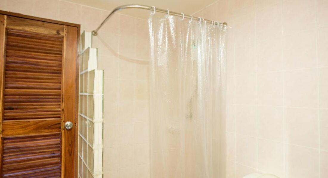 •ванна кімната з душовою кабіною, феном і туалетним приладдям.