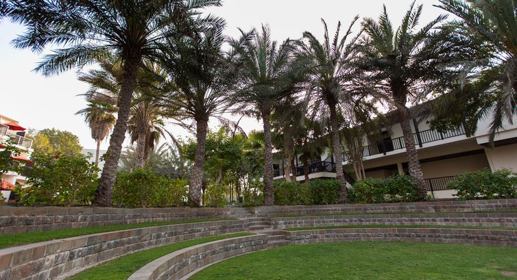 Первой впечатление. Отель делит территорию и пляж в JA Beach. Расположился в 20 минутах от Марины Дубаи, после проезда по промзоне, среди пустыни. Территория отеля большая парковая, как оазис: гольф-поля на 9 лунок, теннисный корт, биосад и конюшня. В отеле Palm Tree растения настолько высокие и разросшиеся, что создают природную тень на дорожки и домики. Главное здание невысокое, где находится только рецепшен и ресторан, дизайн современный и приятный в загородном стиле с открытым пространством. За пределами отеля - пустыня.