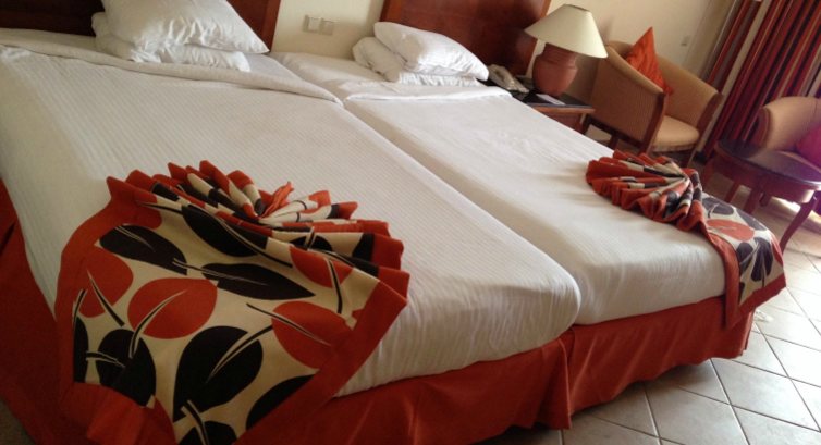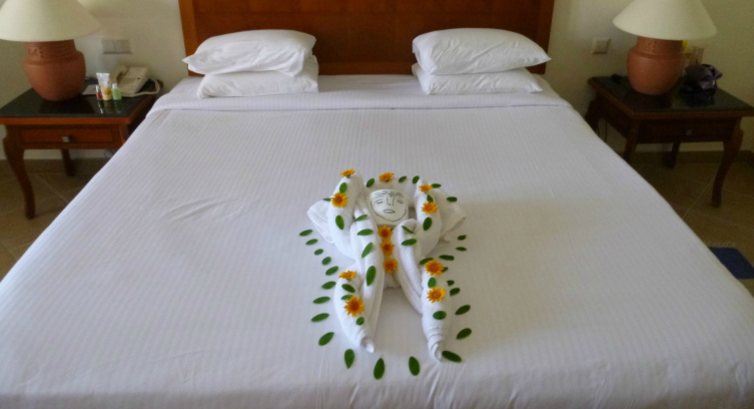 Полотенца в номере меняли и каждый день плели лебедей, за что получали небольшое вознаграждение.Каждый день в номер бесплатно ставили 2 полуторалитровых бутылки воды, клали пакетики с чаем, нескафе, сливки.