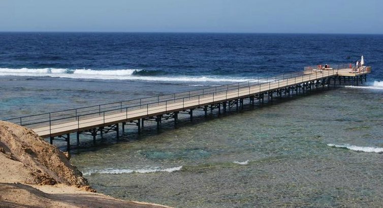 Пирс сделан очень неудачно. Он не доходит буквально два-три метра до места, где начинается настоящая глубина. После спуска с лестницы нужно еще немного пройти по камням, прежде чем полноценно поплыть. Из-за этого с пирса безопасно купаться только в полный штиль. Даже небольшие волны могут ударить о лестницу или опоры пирса. По этой причине во время нашего отдыха за две неделе пирс был открыт открыт пять раз по полдня. В такой же сезон в этом же районе Египта я отдыхал в Краун Плазе (километров пять от Ресты) пирс закрывали только в самый сильный шторм.