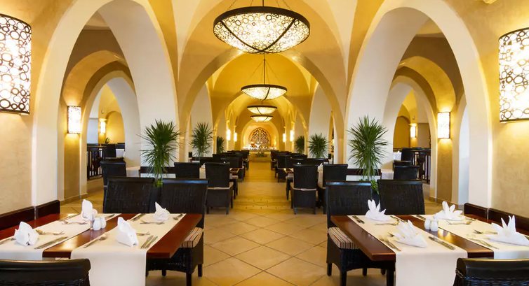На территории несколько ресторанов и баров, в том числе на пляже и у бассейна, голодными как говорится не останетесь, кухня европейская и местная достаточно разнообразная, отельная благодарность кондитеру отеля - в первый раз вижу в отеле "восточные сладости". Завтрак 6.30 - 10.30, обед 12.30-14.30, ужин 19.00-22.00 в главном ресторане AL DAWAN, алкоголь местного производства бесплатно с 10.00, импортный алкоголь платно. Бары в приемной, у бассейна, на пляже. С обслуживанием в главном ресторане никаких проблем место всегда без проблем, обслуживание тоже на уровне - персонал всегда предложит кофе утром в обед или вечером что либо выпить (вино, пиво, что либо более крепкое). Кстати не заметил чтобы кто то из гостей пил что то крепкое, обычно ограничивались вином либо пивом, вечером в баре MAWAL заказывали коктейли.