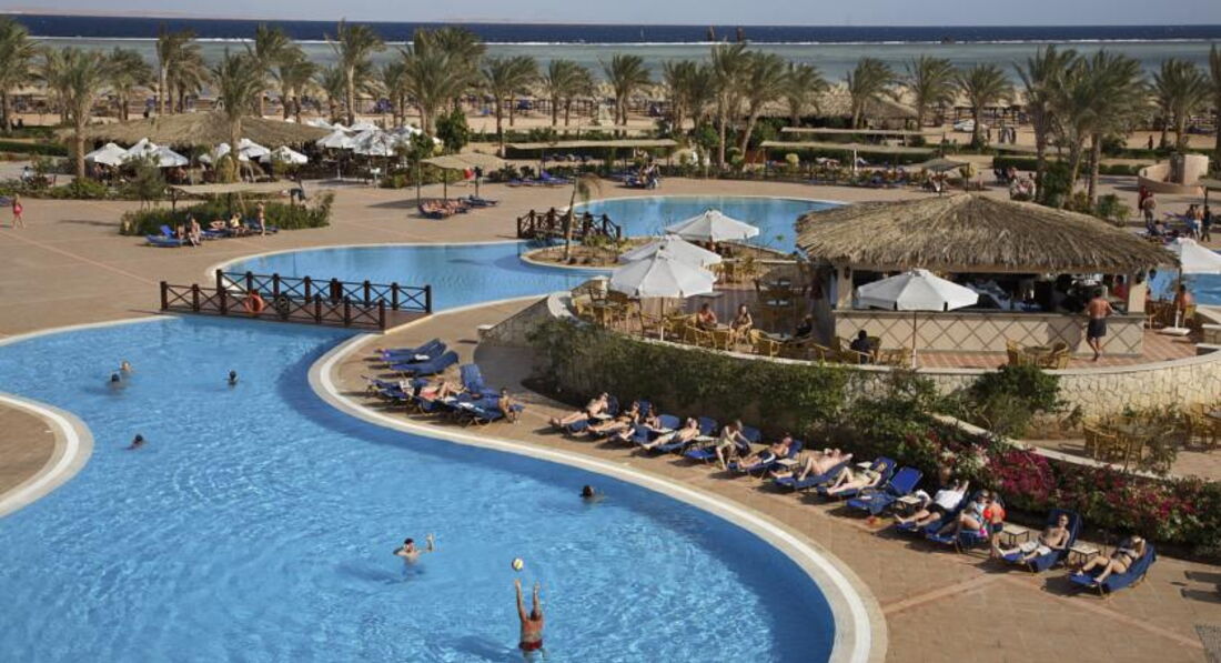 Плавать всегда удобно, так как на территории большущий бассейн располагается. Полежать где-нибудь местечко найдется всегда. Есть аквапарк, который доступен по расписанию. Хотя он далеко не самый лучший и интересный. До пляжа нужно топать приличное расстояние, хоть и отель значится на первой линии. Только сама эта «линия» достаточно протяженная. :) Пляж чист и ухожен. Для того, чтобы скорее добираться до глубокого места в Красном море построен деревянный помост, работающий по расписанию.