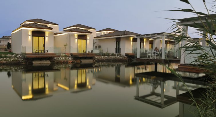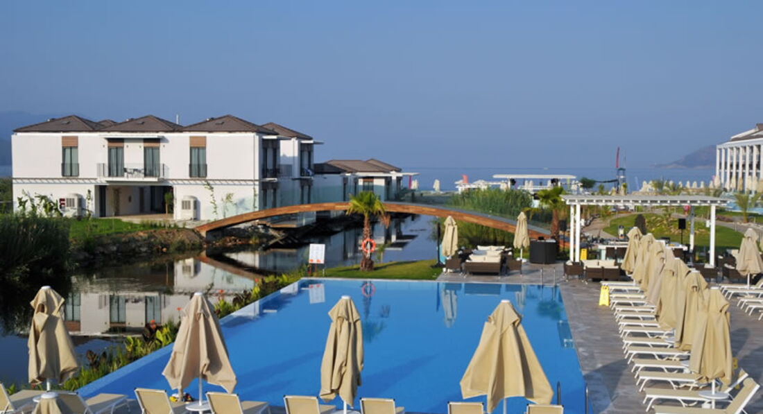 Вот и побывала я,наконец-то,в Фетхие!Отель Jiva Beach Resort 5* я присмотрела еще весной,ждала когда же он откроется.Отель необычной планировки:несколько 2-3 этажных корпусов возле пруда с вынесенными над водой террасами, на берегу моря (между отелем и пляжем дорога,но не очень оживленная). Над водой пруда очень красивый бар.Туристы из других отелей называют Jiva Beach Resort 5* "Отель на воде"