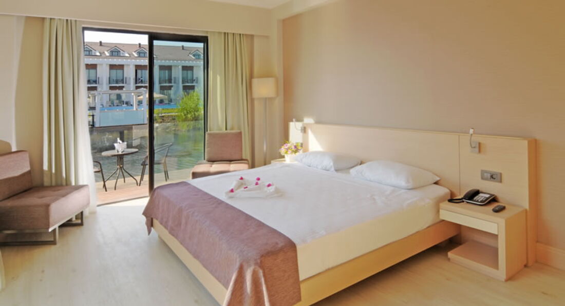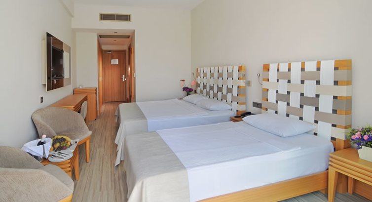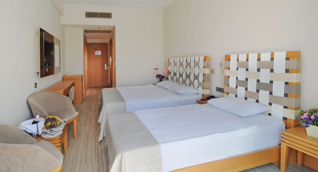 Мы жили в семейном номере (3 комнаты) - убирали почти нормально. Согласна с другими отзывами, что пристрастия в уборке не было, но постели меняли и полы мыли. Интерьер номеров светлый и чувствуешь себя там хорошо. Плазмы во всех комнатах, есть русские каналы, но времени на просмотры у нас не было - ехали ведь на море. На счет моря - да, следовало выбираться чем пораньше - тогда море теплое и спокойное, после 11-00 начинает волноваться, это особо не мешает, но к обеду уже переползаешь в бассейн. Сказать, что отель стоит на море не совсем правда - их разделяет дорога, по которой, в основном, ездят маршрутки в Чалыш и Фетхие - ходят очень часто. С одной стороны - это удобно, поскольку независимо от туроператоров легко выбраться в свое маленькое путешествие, а с другой - отдыхая с маленьким ребенком, вряд ли решишься отправить его самого в бар за соком, ведь на пляже бара нет и нужно бежать к отелю.