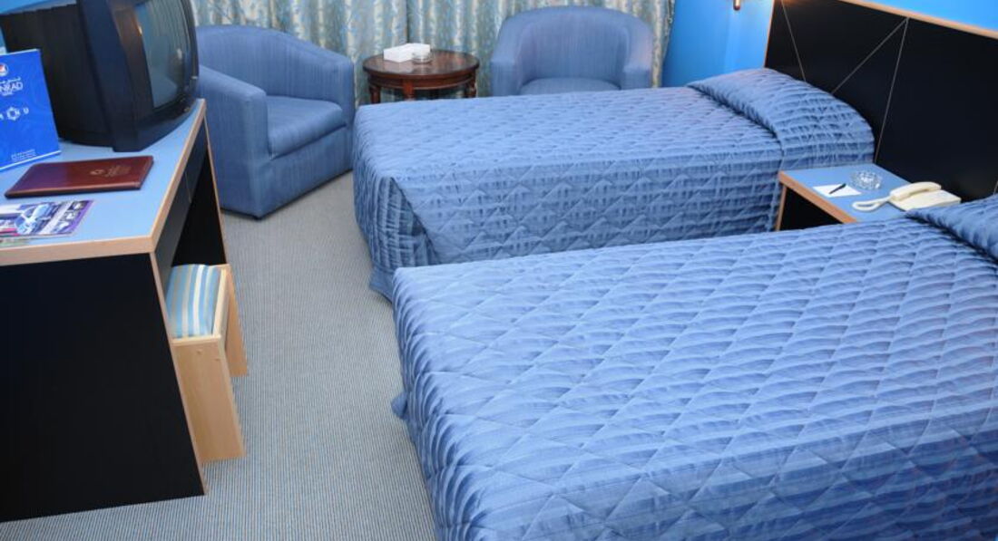 Номера такие маленькие,, что телевизор стоит закрывая собой зеркало, обычно стоят 2 стола один с тв и один с зеркалом, кровати маленькие, у основания кровати торчали гвозди на которые периодически натыкались. Питание обычное, однообразное, но ни йогуртов, ни каш, ни "много" фруктов там нет, бывают фрукты, но их сразу разбирают, кофе вообще пить невозможно-самый дешевый в гранулах, даже не сублимированный, но никто не отравился, все свежеприготовленное было. Ресторанчик такой же маленький как и номера, протискиваешься между стульев еле еле, да еще и с тарелкой. Персонал равнодушен ко всему, просьбы игнорируют, английский не всегда понимают или не хотят. Питьевую воду принесли только в первый день 2 бутылки по 0,5 потом попросили еще воды, принесли за 6 дирхам 1 литровую бутылку. С номером нам еще повезло окна были на дорогу, а не как с другой стороны коридора на соседний дом с шумными кондиционерами и с вывешанными носками из окон. Хотя и воняло из рыбного ресторана напротив, тк окно было сломано и просто плотно не закрывалось. В коридоре постоянно воняет дихлофосом. Автобус на с пляжа никого не ждет и не запоминает в лицо, как тут писали время пришло-закрывает дверь и едет, причем едет так, как будто он мешки с картошкой везет. Постояльцы в отеле из России (в основном из областей), Египта, Украины, и какие то местные сирийцы или еще кто то с филлипинским сопровождением. Wi-fi у них платный, даже на ресепшн, что несколько удивило (час-10 дрх, день-25). Каналов телевизионных очень мало- один русский, остальные арабские, только один еще на английском. Ванная с туалетом это вообще отдельная песня - бачок унитаза был расколот на мелкие кусочки, а потом, внимание, склеен чем то черным, типа шпаклевки, а вдоль верхнего края ванны был проводок, либо к телефону либо к фену. Все конечно работало, вода текла чистая. Уборка в номерах стандартная, белье не меняют каждый день, опять же как многие тут пишут, просто умеют правильно застелить, с крыши кстати видно где стирают и сушат белье, лучше не смотреть))