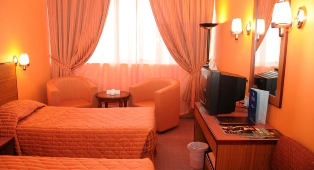 Жили вдвоем с женой. Общее впечатление об отеле - хорошее, рекомендуем. Правда, вида из окна хорошего не ждите, да и некоторым может показаться шумновато, т.к. рядом на улице достаточно интенсивное движение, недалеко пролетают взлетающие самолеты. Однако, гуляя в этом районе, заметили, что расположение большинства отелей в Дейре еще хуже. Номер у нас был достаточно скромный, но уютный и практически новый. В номере - неплохой встроенный кондиционер, небольшой холодильник и телевизор с небольшим количеством каналов, телефон.