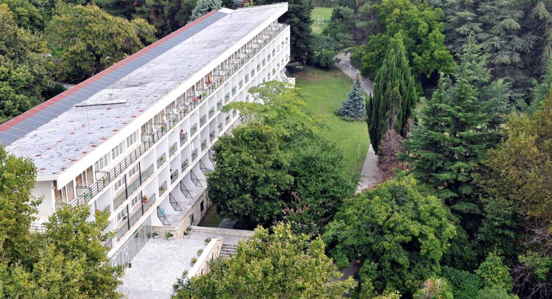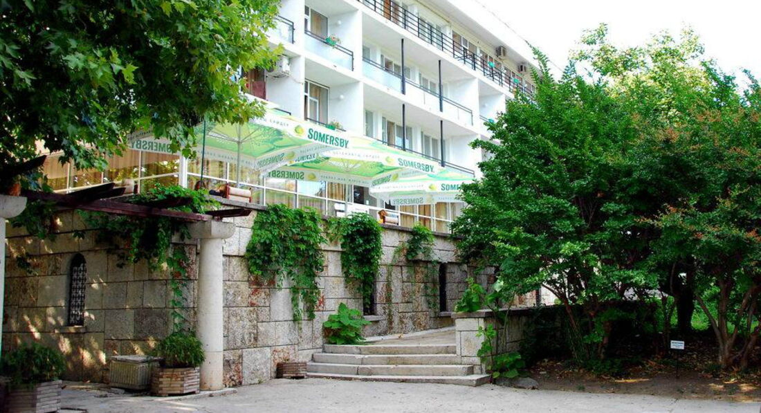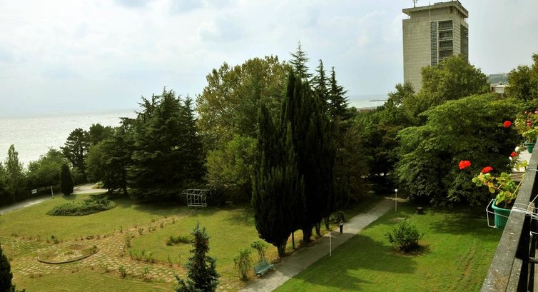 Большое здание не работает, работает только маленький корпус. Место тихое, уютное. Присуствует частично уныние и разруха, но это даже придает определенный шарм. Территория шикарная. По сути - мини ботанический сад. Свой пляж маленький, неухоженный и неохраняется, но в этом тоже свои плюсы - бесплатные зонты, никаких буйков и спасателей, если ты уверен в своих силах - плавай где хочешь и когда хочешь (хоть ночью). Остальные ходят на пляж Кабакум. Состояние номеров и коридора вполне нормальное. В бассейне не купались.