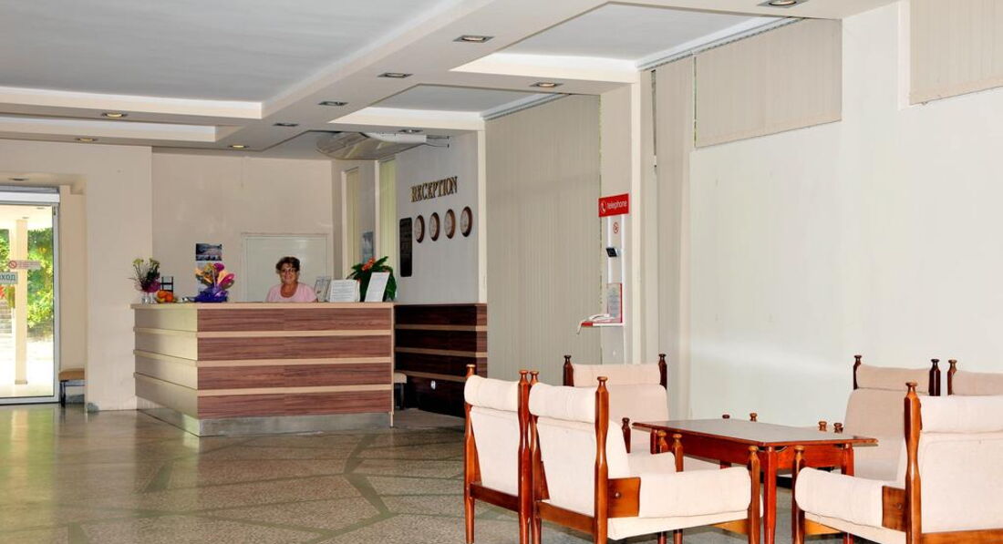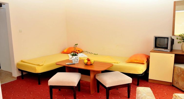 Отдыхали в июле 2014г с дочкой-28 лет и внучкой-6 лет-всем понравилось! Во-первых-территория большая и зелёная-есть ботанический сад-по сравнению с отелями в городе-тут срокойно, безопасно-дети гуляют по парку, у бассейна-машин на территории нет-все в зелени,что создаёт прохладу и свежесть.Питание хорошее, особенно мясо-всегда мягкое,без жира и жил-соусы разные, всегда нарезка разных овощей.Фрукты ежедневно в обед, пеолдник и ужин-яблоки,арбузы, дыни, персики, абрикосы, нектарины.А какие пироженки-пальчики оближешь! Вино белое,красное, пиво, ракия.Уборка ежедневная. Персонал приветливый-если что надо-тут же откликаются.В комнате телевизор,3 или 4 русских канала-но смотрели редко-приходили домой только ночевать-всё на море или экскурсиях-такжеестькондиционер и холодильник. Советую отель-море рядом, недорогой-разговаривала с людьми и из 4-х зв отелей-у них не было того,что у нас,да и жили они от моря далековато