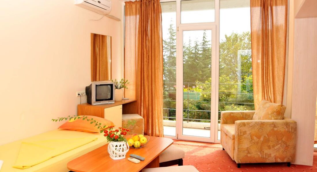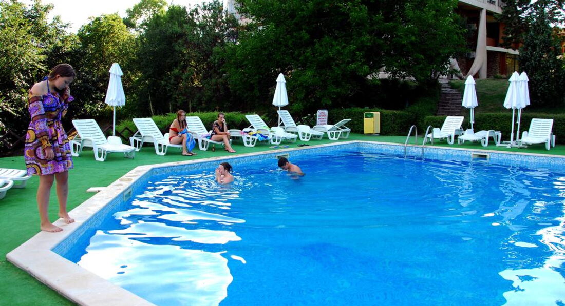 Отдыхала с мужем в первой декаде сентября 01.09.15г.-09.09.15г. 2015г. Ехали с г. Кишинёва очень хорошим автобусом. Выезд с г. Кишинёва был 01.09.15г. в 18.00часов, а приезд в отель около 05.00 часов утра 02.09.15г. Нам сразу предоставили дежурную комнату для отдыха, а в 12.00 часов дня нас переселили в стандартный номер(более того нам повезло-нас поселили в комнату студио, где можно поселить 4-ре чела.) в 4-х этажном корпусе. Этот отель нас устраивает: всегда чистая комната, чистая постель, отличный вид из окна в парк, море 1-я линия, бассейн в парке, очень доброжелательное обслуживание на ресепшин. Размещение отличное, питание хорошее: всё скромно, но горячая еда и всё необходимое было: суп, нарезка мяса, вторые блюда, салаты, оливки, сладкое, очень вкусный хлеб, чай....в общим голодными никогда не будете. Я с мужем по питанию выбрала полупансион т.е. завтраки и ужины и нас всё устроило. Большое спасибо шэф повару и его помощникам!!! Пляж возле отеля небольшой, но в сентябре отдыхающих не так много, по-этому места всем было достаточно. Самое главное, что море чистейшее и классно пахнет йодом. Если хотите разнообразия относительно пляжа, то можно пойти на пляж Кабакум, он совсем рядом, а можно пойти в сторону Золотых песков и там поплавать-всё реально. Желательно с собой взять зонтик от солнца, чтобы там не платить деньги и можно расположиться в любом желаемом месте на пляже. Было бы не плохо взять с собой кипятильник, чтобы попить чай в номере в любое время. В целом можно сходить в г. Золотые пески за 30 минут, в г. Варну ехать 20-30 минут от нашего отеля. Я с мужем очень благодарны всему персоналу отеля за их труд и внимание к отдыхающим. Мы снова хотим приехать в сентябре 2016г. к Вам на отдых. Прекрасного Вам летнего сезона, приятных отдыхающих и замечательной погоды!!! До встречи!!!