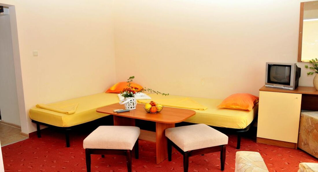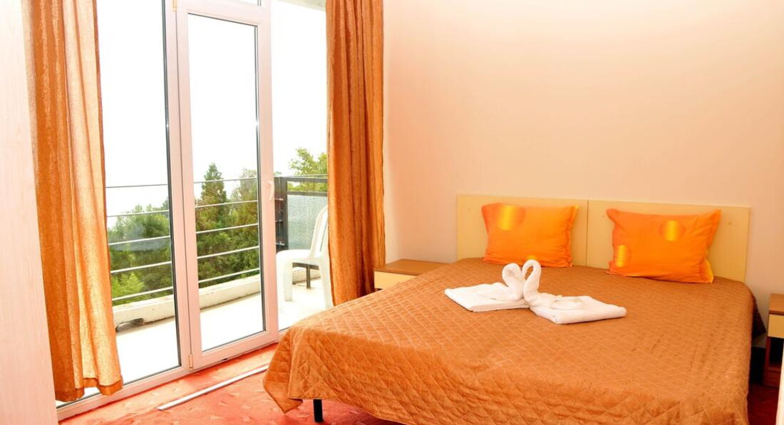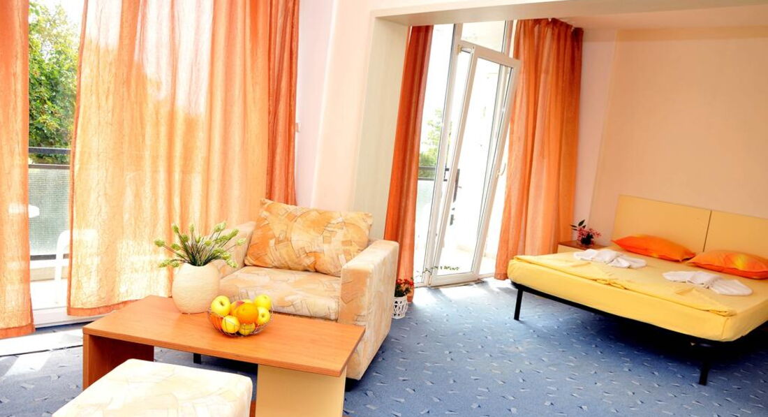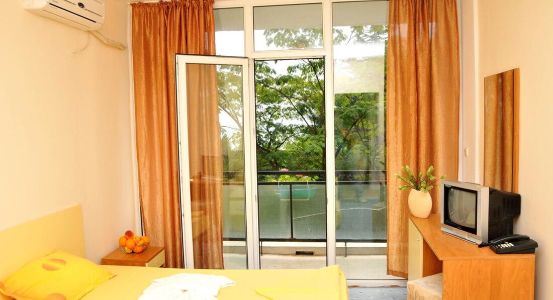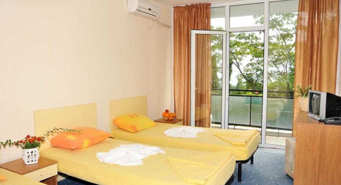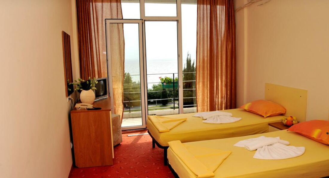 Скажу сразу, мы люди не привередливые, поэтому нам понравилось все! Отель состоит из двух корпусов: 1- высотный, 2 звезды; 2-й четырехэтажный, 3 звезды. Отдыхали в трехзвездочном отеле в июле 2010 года с ребенком 10 лет. Отель после ремонта, поэтому в номере нам понравилось все. Интерьер оформлен в желто-оранжевом цвете, все достаточно гармонично, новая сантехника. Поначалу, правда, не могли привыкнуть к душу, слив которого - просто дыра посреди пола, что создает некоторые трудности в посещении санузла после пользования душем. Но это особенность болгарских санузлов, у них редко где можно встретить душевые поддоны или хотя бы ограничения в виде бортика. Но в целом, все хорошо. И самое главное, что было для нас определяющим - это потрясающий вид из окна на море. Отель построен таким образом, что все номера с видом на море.
