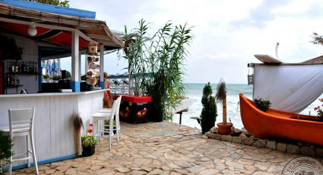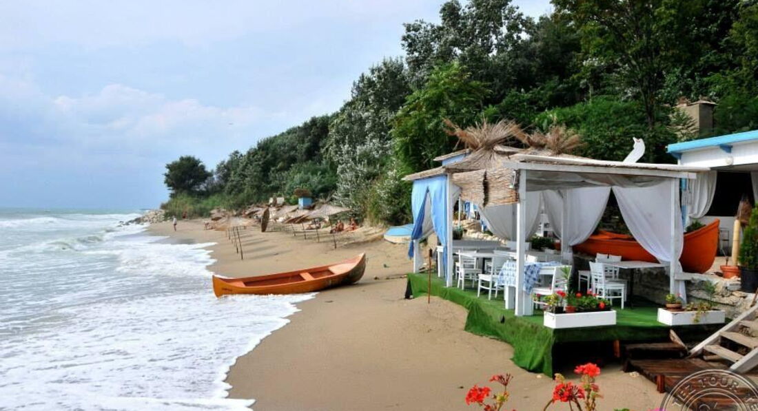 Очень понравилось местоположение самого отеля, личный небольшой пляж, который охраняется и убирается, огромная территория с экзотическими растениями (под каждым из них стоит табличка с названием как в ботаническом саду), по которой было приятно гулять. На территории есть небольшой бассейн с баром, в бассейне есть, так называемый, лягушатник для маленьких деток. Отель рассчитан на семьи с детьми, которые не любят особого шума, дети были разных возрастов с полугода до шестнадцати лет. Рядом с отелем находится огромный городской пляж и горячий сероводородный источник. До Золотых песков пешком идти 25 минут, там куча сувенирных лавок, магазинчиков, кафешек, а также аттракционов для детей. Кстати, при выходе за территорию отеля также есть несколько сувенирных лавок. До аквапарка на автобусе ехать минут десять-пятнадцать, до Варны - тридцать.