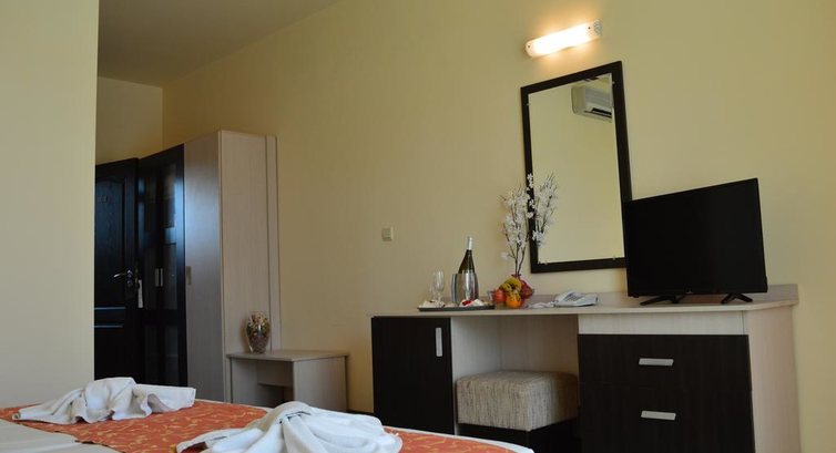 Очень хороший отель для спокойного семейного отдыха.Хороший современный номер .Телевизор,холодильник,сантехника,все работает отлично.Внимательный персонал.Хозяин отеля Боян и его жена Искра замечательные люди и отличные хозяева.Все под их контролем.Огромный им привет.Отель расположен у дороги ,но все так продумано,что шума от дороги практически не слышно.Завтраки европейские ,выбор не большой но голодными точно не останитесь.Сначала ходили ужинать за пределы отеля,но потом поняли,что в отеле достойный ресторан и по качеству и по ценам.Хороший небольшой бассейн,с лежаками проблем нет,хотя отель был заполнен.До моря десять минут прогулочным шагом.Сам посёлок тоже очень понравился тихо,спокойно ,чисто,нет суеты как вСолн береге.Отель очень советую,на следующий год только сюда.