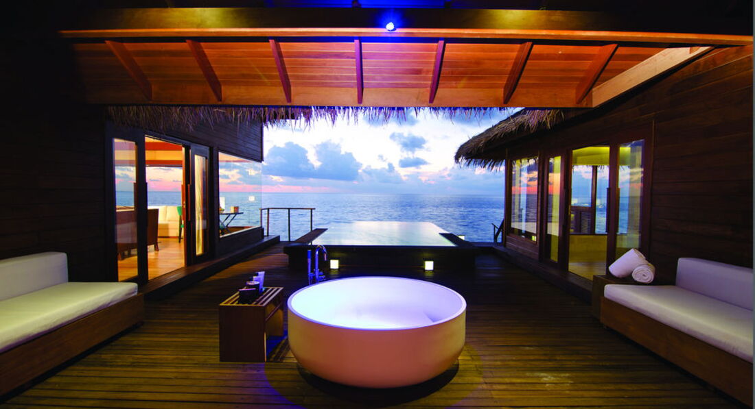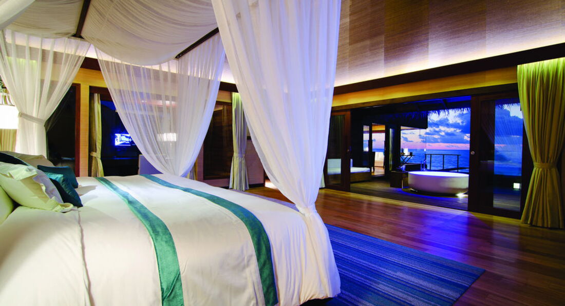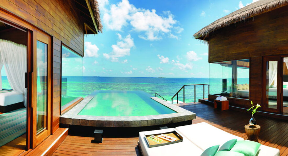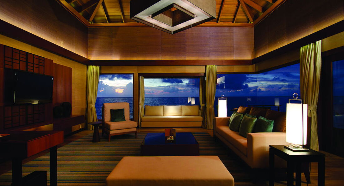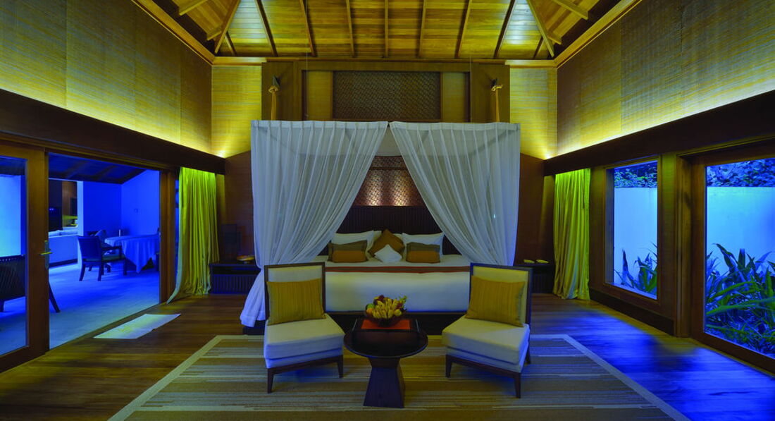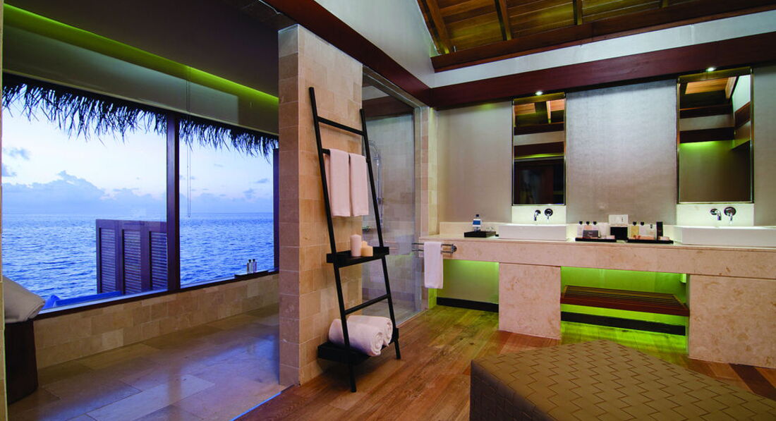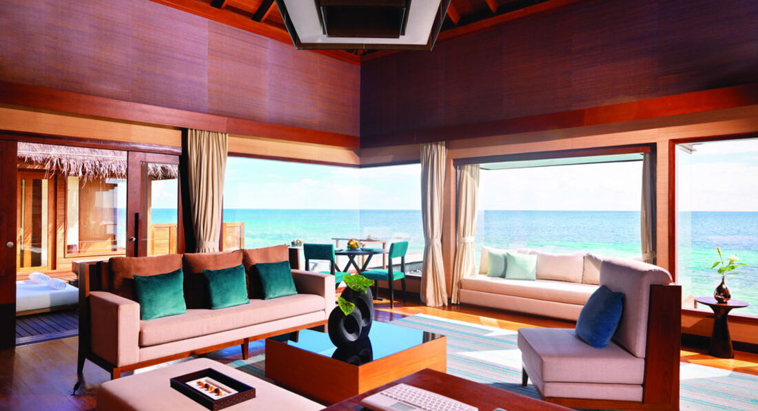 2 Ocean Sanctuary Suite (вид на схід або захід сонця, 340 м2, макс. 4+2 чол.). Розкішні водні вілли, що стоять на палях у воді за 800 метрів від острова, з індивідуальним спуском у лагуну. Вілла включає дві спальні, дві ванні кімнати, вітальню, робочу зону, власний басейн, окрему терасу з індивідуальним спуском в лагуну. Головна спальня: ліжко king-size (3х2 м), телевізор із 42-дюймовим плоским екраном, вікна на всю стіну з видом на басейн та океан. Є вбиральня. Головна ванна кімната складається з мармурової ванни, двох мармурових раковин, туалетного столика з дзеркалом для макіяжу та зливового душу з видом на океан. Друга ванна аналогічна. У другій спальні є два окремі ліжка (1х2 м), письмовий стіл, телевізор та вікна на всю стіну з видом на басейн та океан. Є вбиральня. Вілла включає вітальню з телевізором і їдальню з панорамним видом на басейн і океан. Їдальня знаходиться на терасі, яка веде до власного басейну (20 м2) та власної тераси над водою з шезлонгами та спуском у воду.