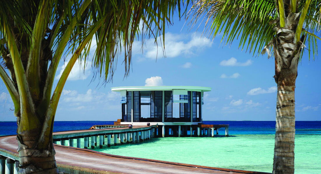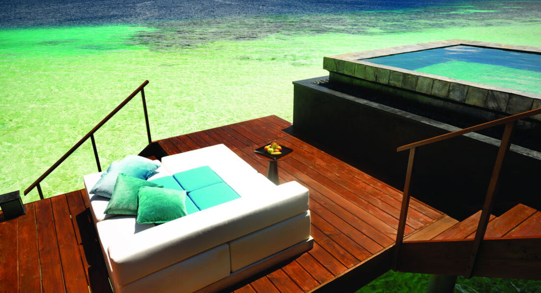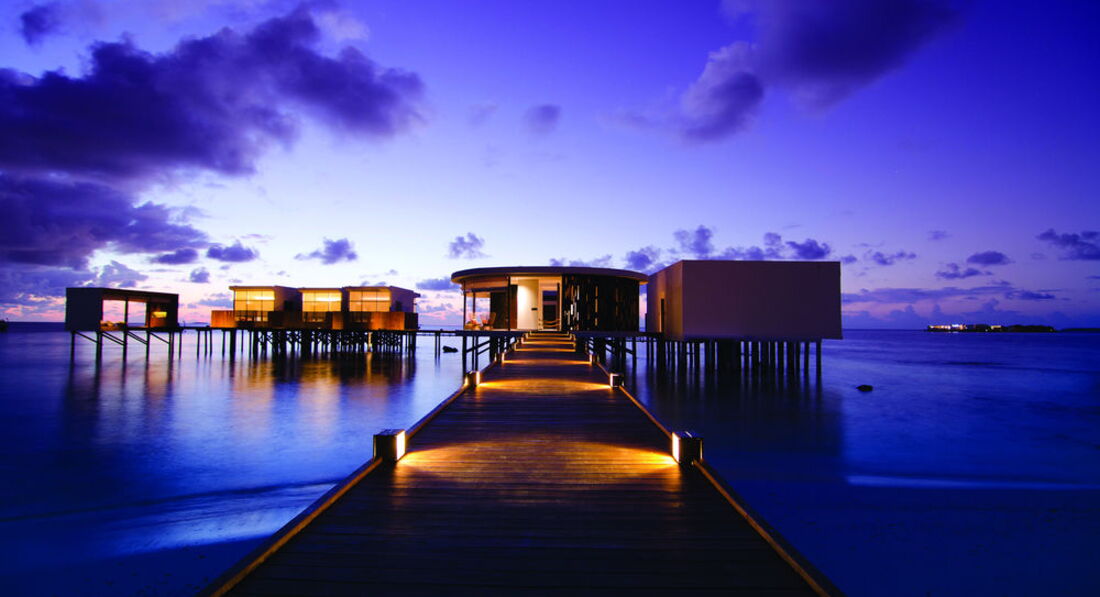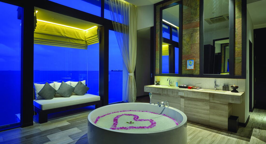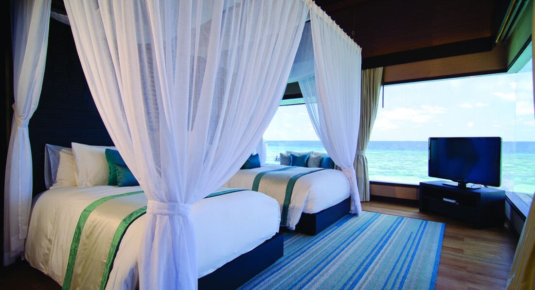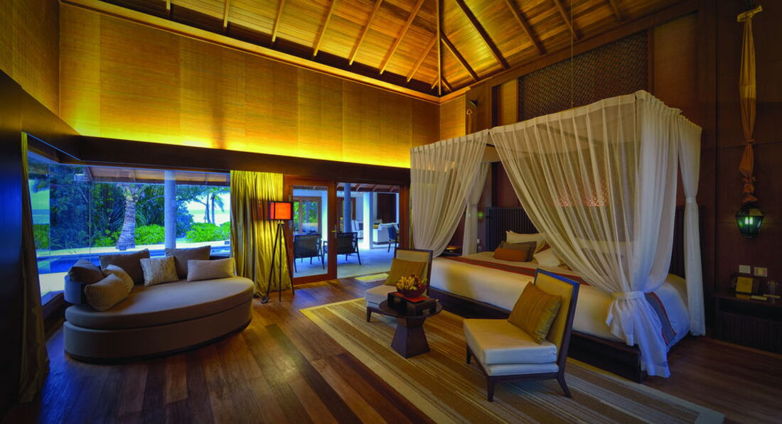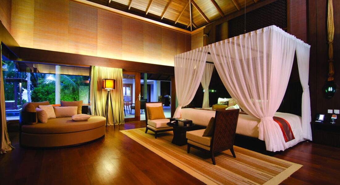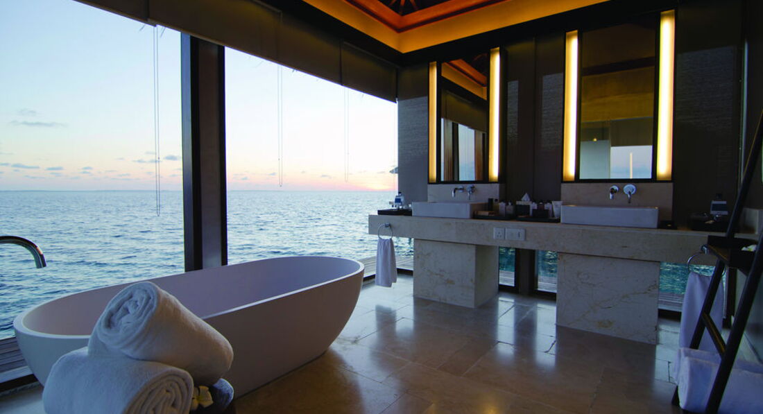 2 Ocean Sanctuary Suite (вид на схід або захід сонця, 340 м2, макс. 4+2 чол.). Розкішні водні вілли, що стоять на палях у воді за 800 метрів від острова, з індивідуальним спуском у лагуну. Вілла включає дві спальні, дві ванні кімнати, вітальню, робочу зону, власний басейн, окрему терасу з індивідуальним спуском в лагуну. Головна спальня: ліжко king-size (3х2 м), телевізор із 42-дюймовим плоским екраном, вікна на всю стіну з видом на басейн та океан. Є вбиральня. Головна ванна кімната складається з мармурової ванни, двох мармурових раковин, туалетного столика з дзеркалом для макіяжу та зливового душу з видом на океан. Друга ванна аналогічна. У другій спальні є два окремі ліжка (1х2 м), письмовий стіл, телевізор та вікна на всю стіну з видом на басейн та океан. Є вбиральня. Вілла включає вітальню з телевізором і їдальню з панорамним видом на басейн і океан. Їдальня знаходиться на терасі, яка веде до власного басейну (20 м2) та власної тераси над водою з шезлонгами та спуском у воду.