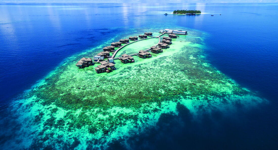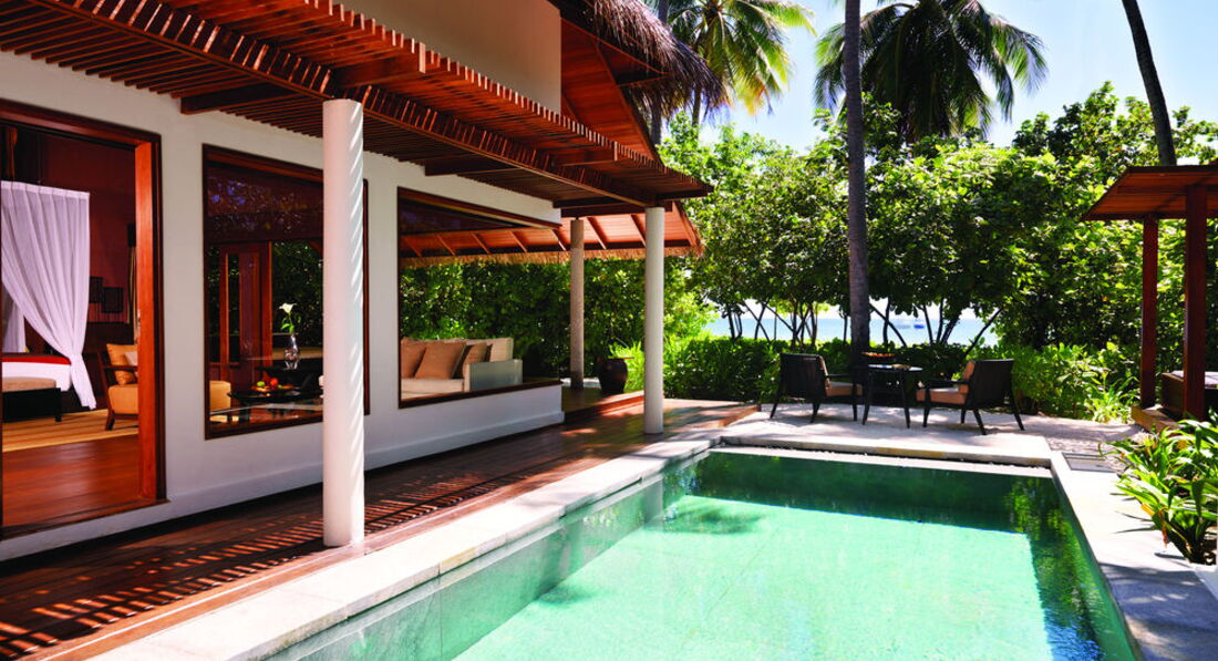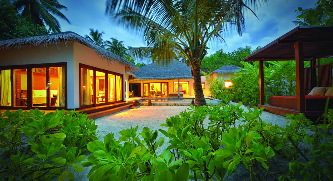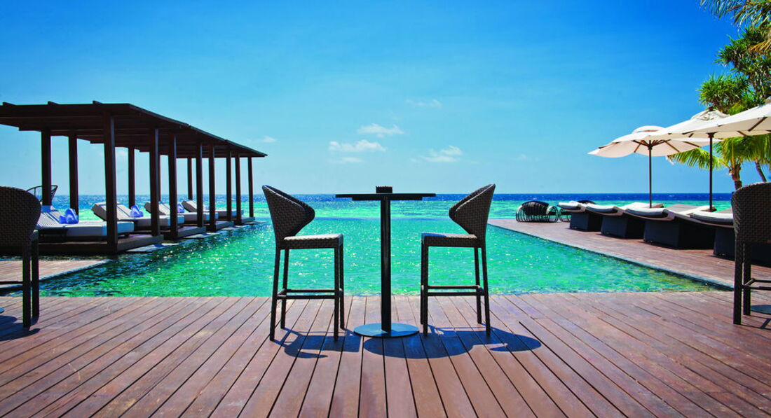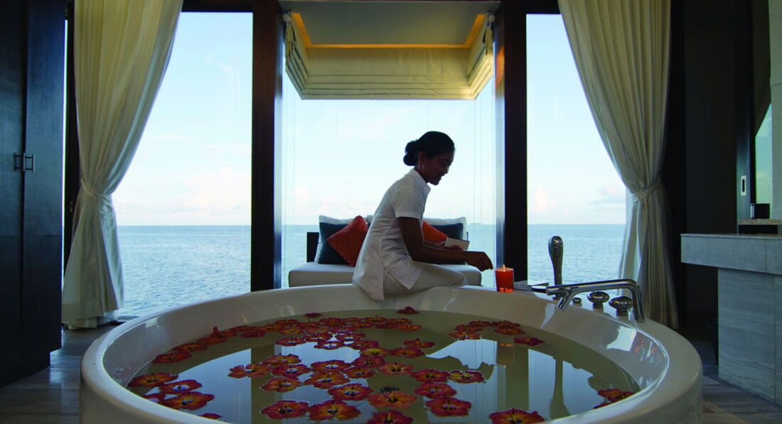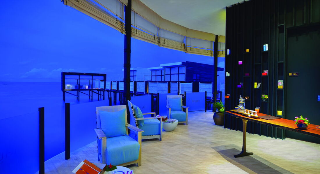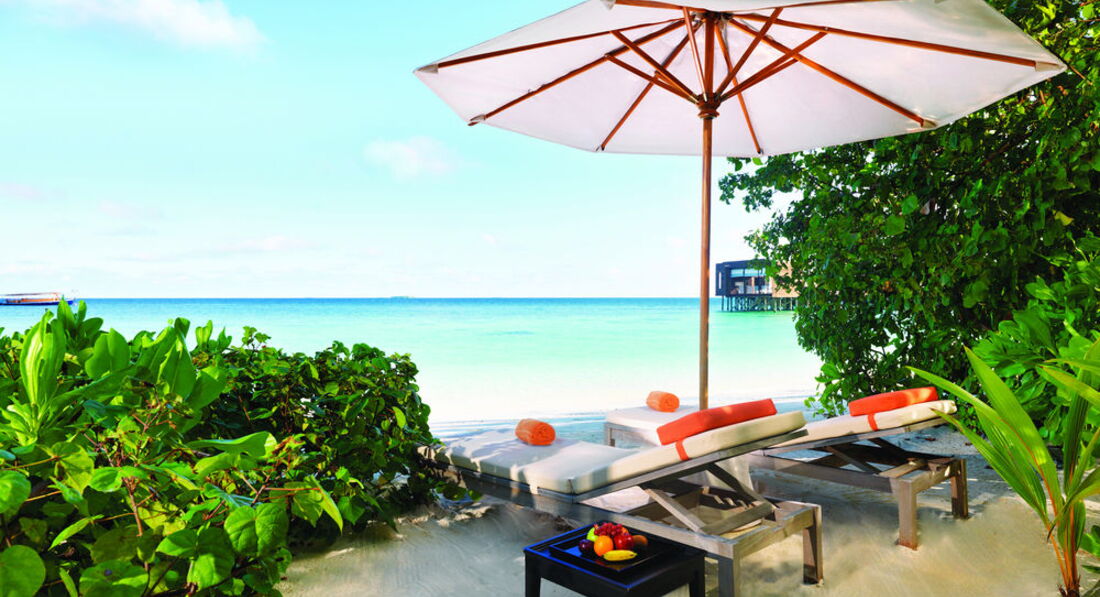 2 Ocean Sanctuary Suite (вид на схід або захід сонця, 340 м2, макс. 4+2 чол.). Розкішні водні вілли, що стоять на палях у воді за 800 метрів від острова, з індивідуальним спуском у лагуну. Вілла включає дві спальні, дві ванні кімнати, вітальню, робочу зону, власний басейн, окрему терасу з індивідуальним спуском в лагуну. Головна спальня: ліжко king-size (3х2 м), телевізор із 42-дюймовим плоским екраном, вікна на всю стіну з видом на басейн та океан. Є вбиральня. Головна ванна кімната складається з мармурової ванни, двох мармурових раковин, туалетного столика з дзеркалом для макіяжу та зливового душу з видом на океан. Друга ванна аналогічна. У другій спальні є два окремі ліжка (1х2 м), письмовий стіл, телевізор та вікна на всю стіну з видом на басейн та океан. Є вбиральня. Вілла включає вітальню з телевізором і їдальню з панорамним видом на басейн і океан. Їдальня знаходиться на терасі, яка веде до власного басейну (20 м2) та власної тераси над водою з шезлонгами та спуском у воду.