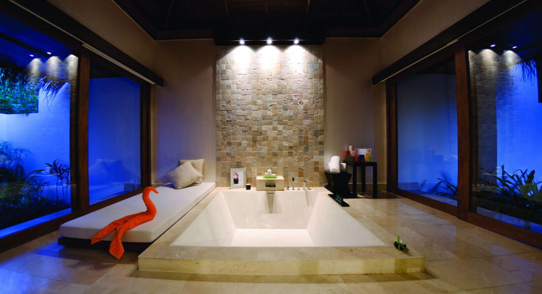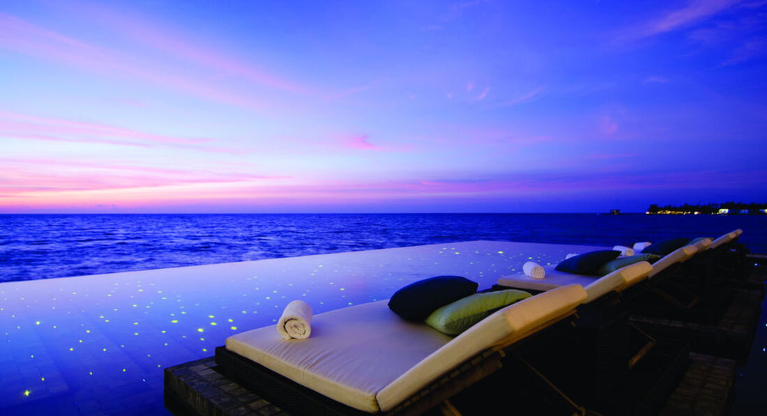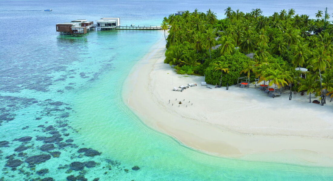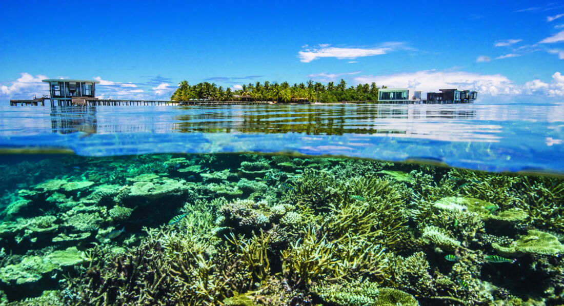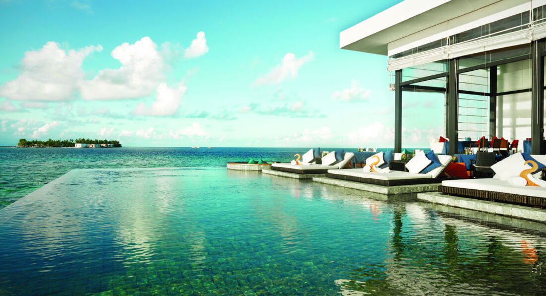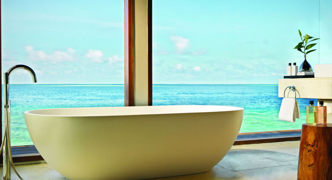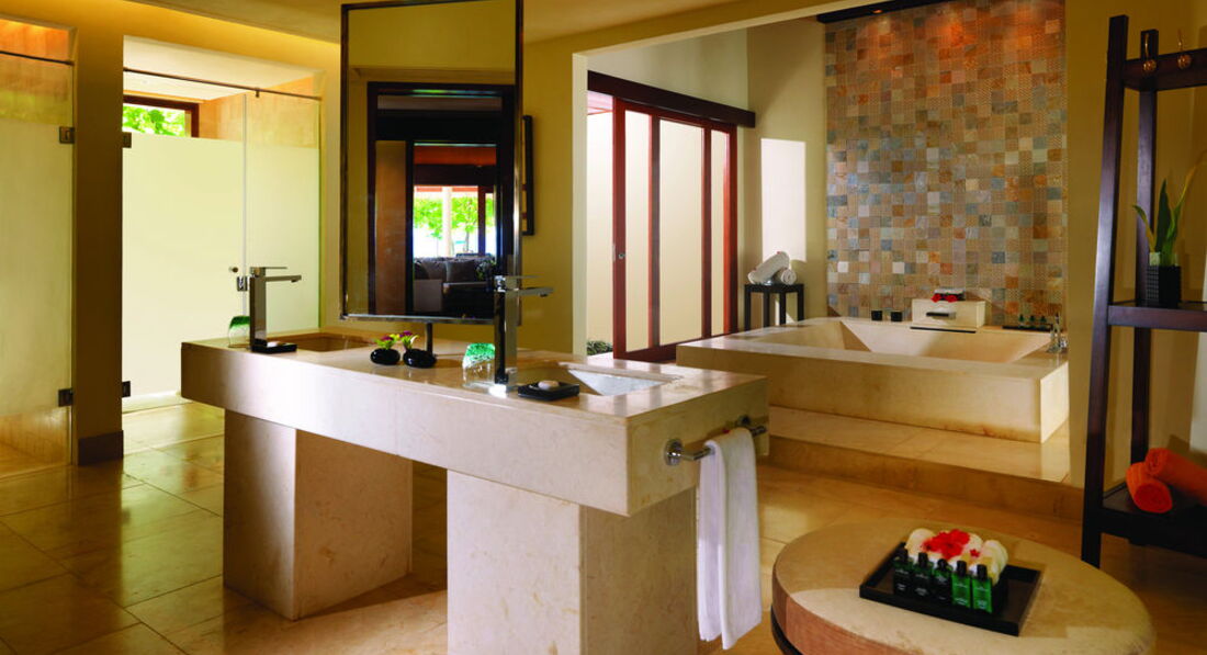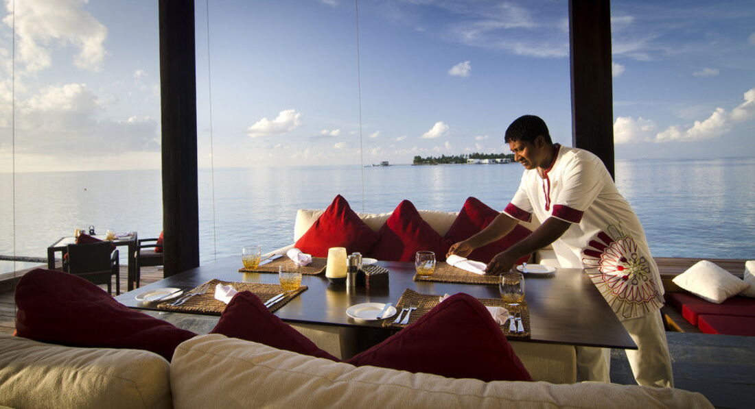 2 Ocean Sanctuary Suite (вид на схід або захід сонця, 340 м2, макс. 4+2 чол.). Розкішні водні вілли, що стоять на палях у воді за 800 метрів від острова, з індивідуальним спуском у лагуну. Вілла включає дві спальні, дві ванні кімнати, вітальню, робочу зону, власний басейн, окрему терасу з індивідуальним спуском в лагуну. Головна спальня: ліжко king-size (3х2 м), телевізор із 42-дюймовим плоским екраном, вікна на всю стіну з видом на басейн та океан. Є вбиральня. Головна ванна кімната складається з мармурової ванни, двох мармурових раковин, туалетного столика з дзеркалом для макіяжу та зливового душу з видом на океан. Друга ванна аналогічна. У другій спальні є два окремі ліжка (1х2 м), письмовий стіл, телевізор та вікна на всю стіну з видом на басейн та океан. Є вбиральня. Вілла включає вітальню з телевізором і їдальню з панорамним видом на басейн і океан. Їдальня знаходиться на терасі, яка веде до власного басейну (20 м2) та власної тераси над водою з шезлонгами та спуском у воду.